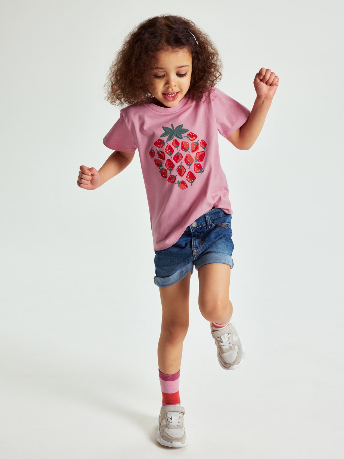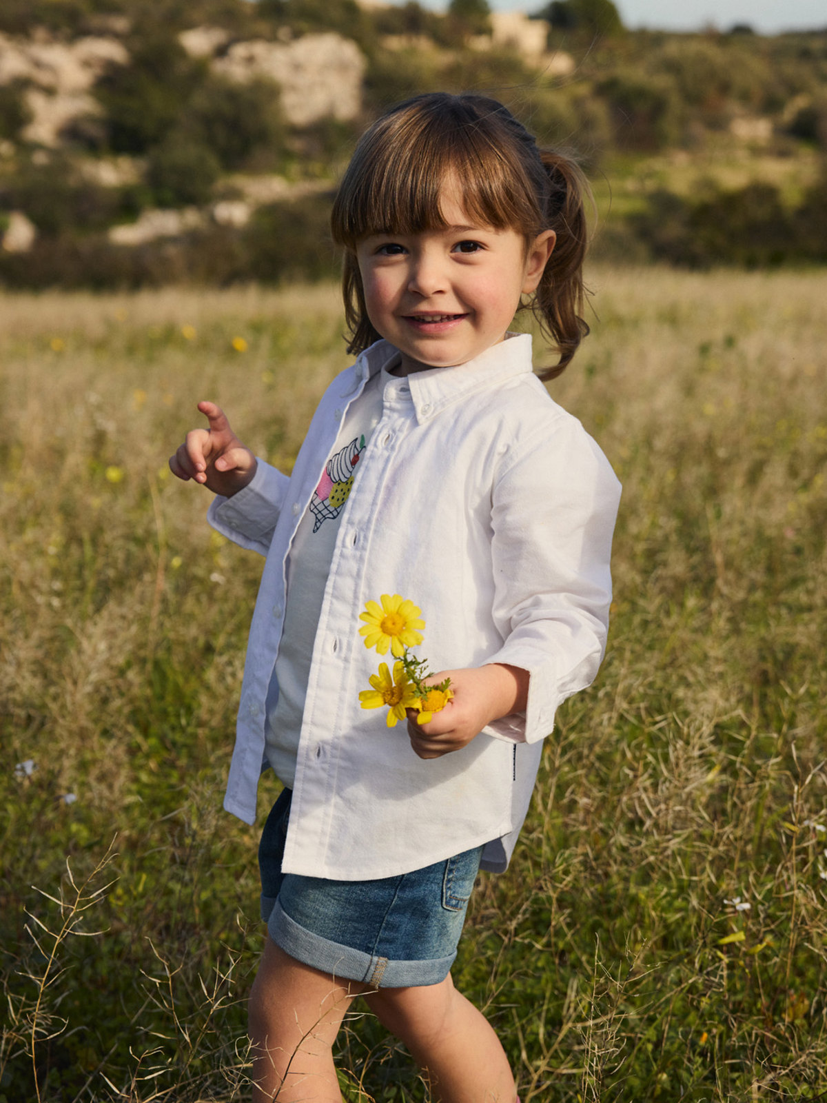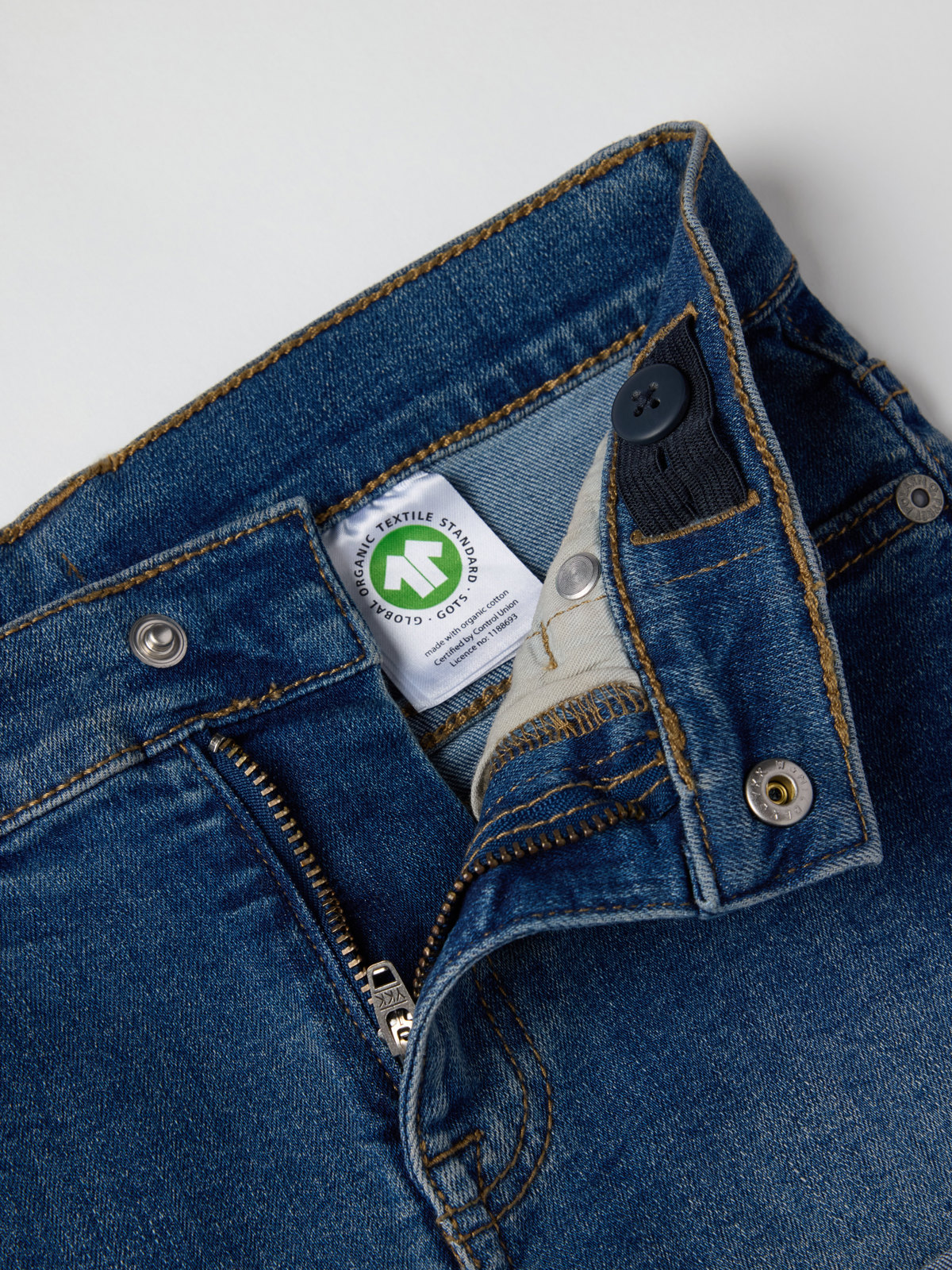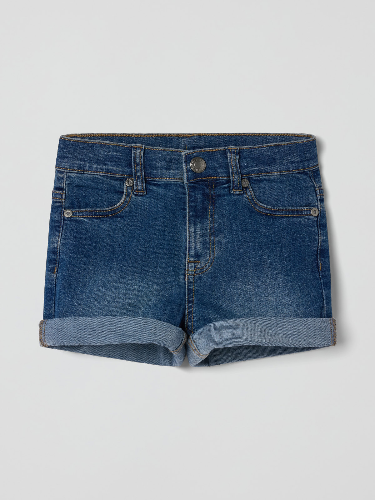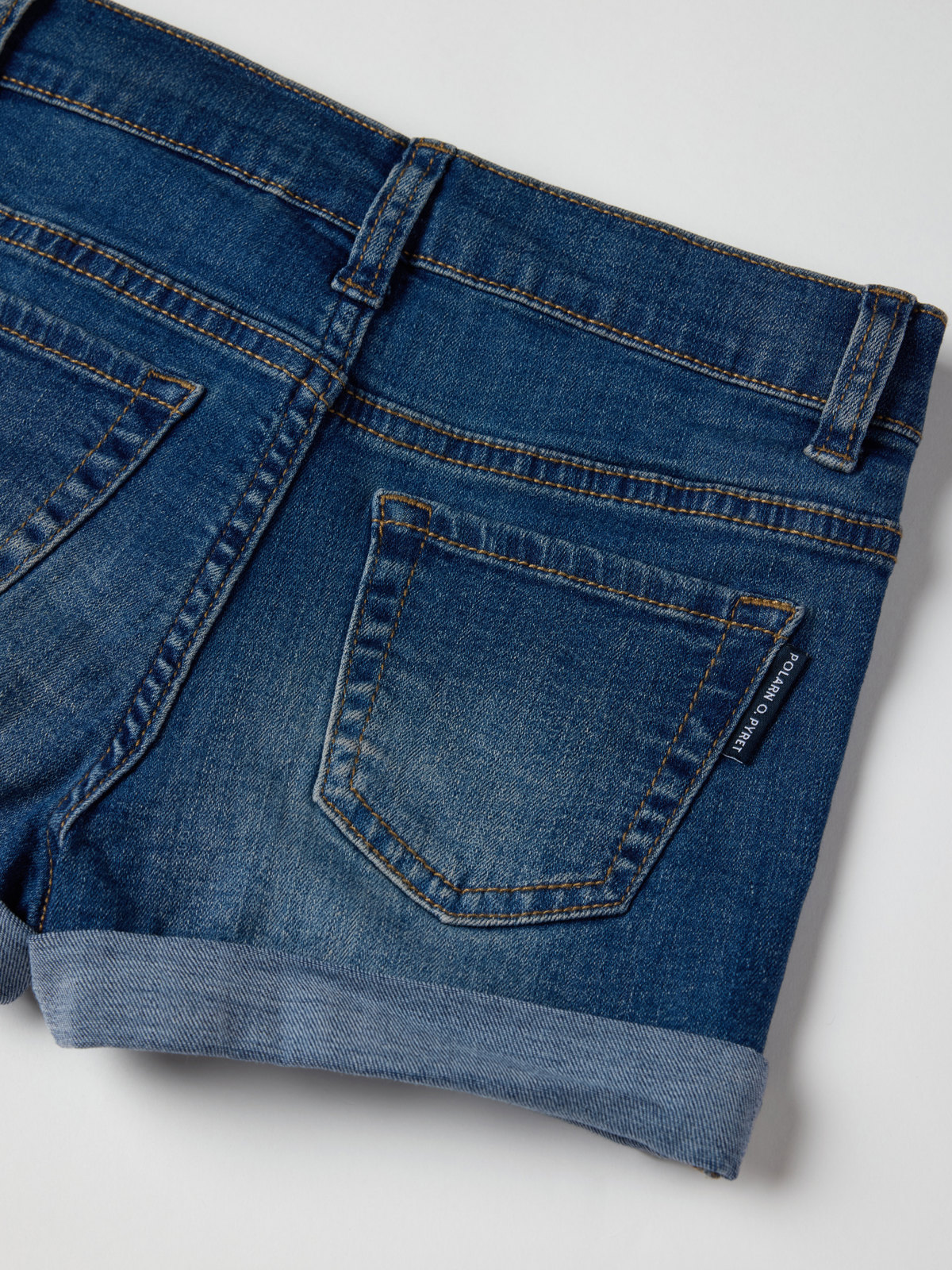 Kort jeansshorts i 100 % økologisk bomull med regulerbar midje og beltehemper. Shortsen har oppbrett nederst på bena. Gylfen lukkes med trykknapp og glidelås.