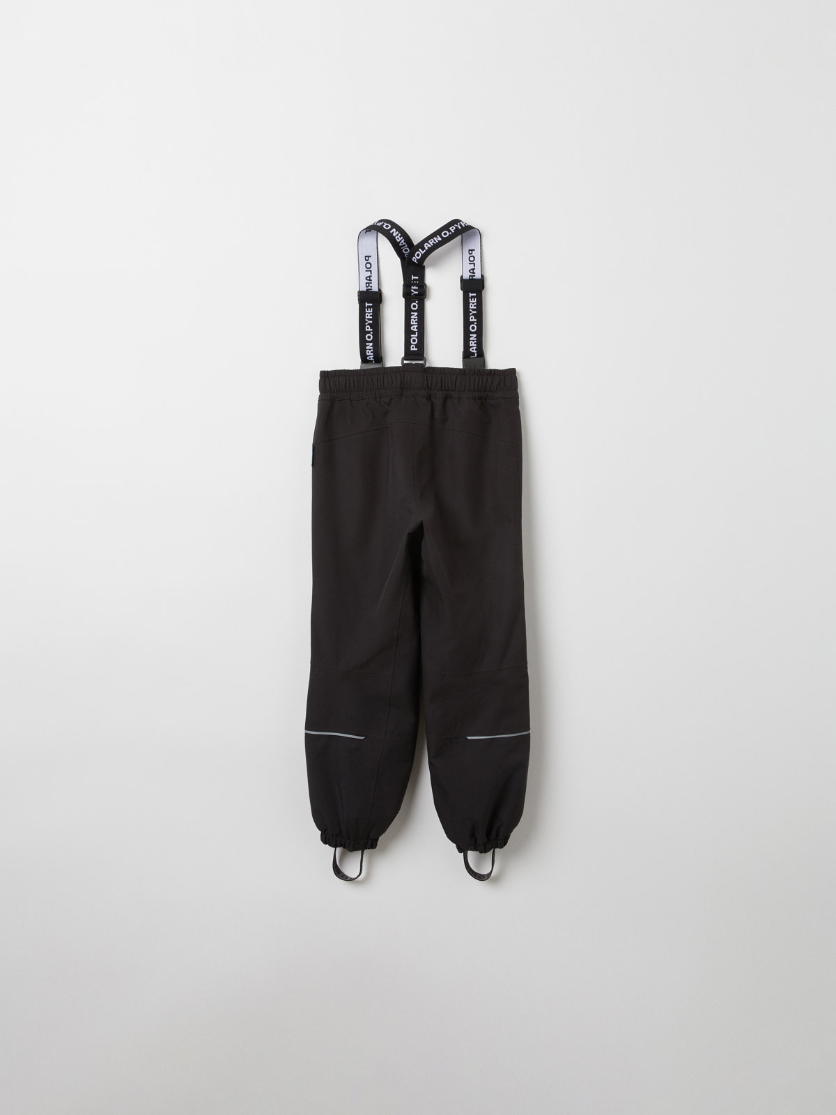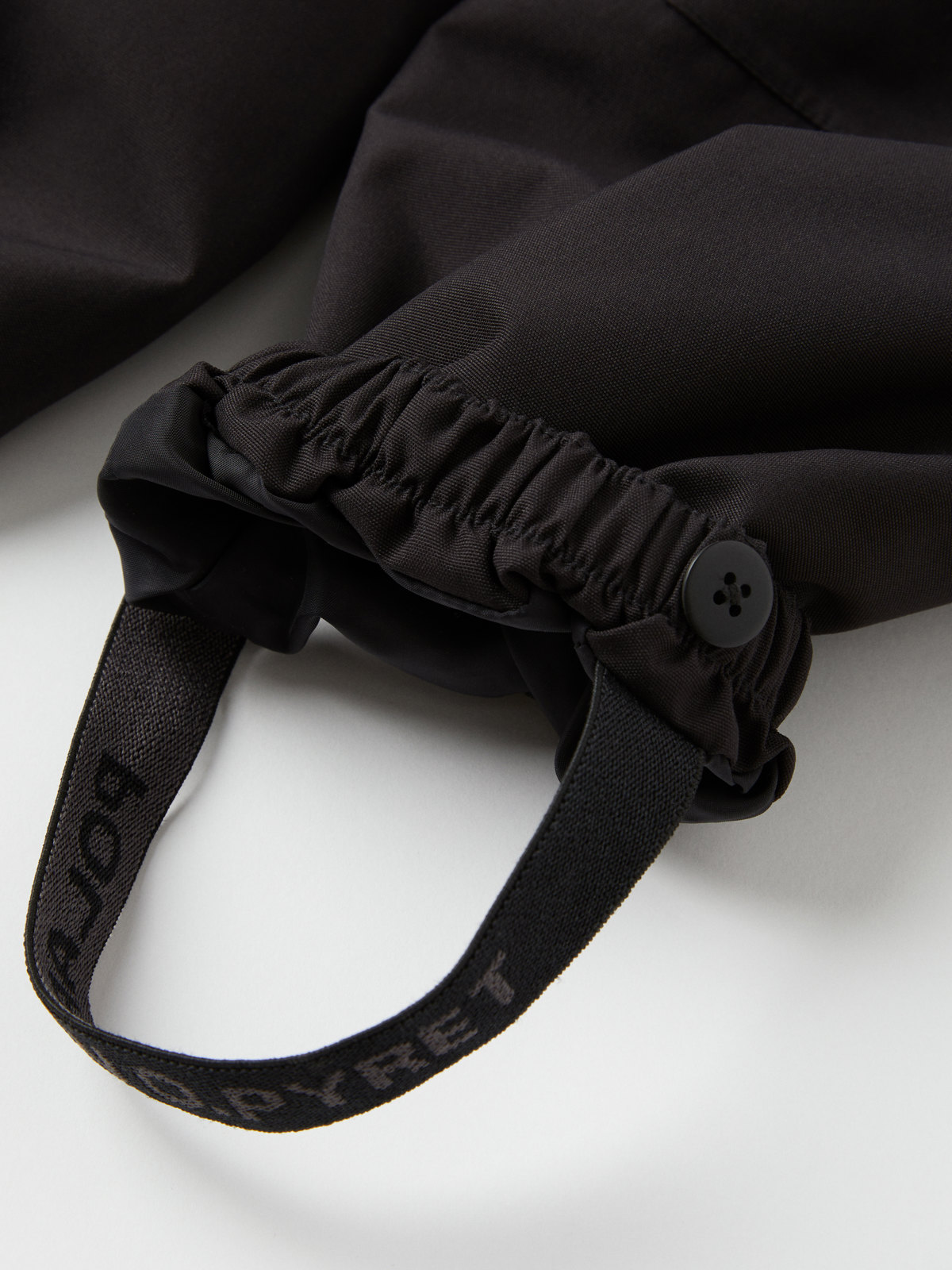 Skallbuksen er myk og smidig, og fremstilt i vind- og vanntett materiale. Buksen er i et slitesterkt materiale og har god pusteevne, siden den slipper ut overskuddsvarme og fuktighet. De helteipede sømmene gjør plagget helt vanntett. Buksen har dessuten avtakbare, justerbare seler og regulerbar midje, samt formsydde knær og strikk nederst på bena for økt bevegelighet og perfekt passform. Gylfen lukkes med trykknapp og glidelås. De utskiftbare fotstrikkene holder buksebena på plass. Størrelsene 134-140 har ikke fotstrikker.