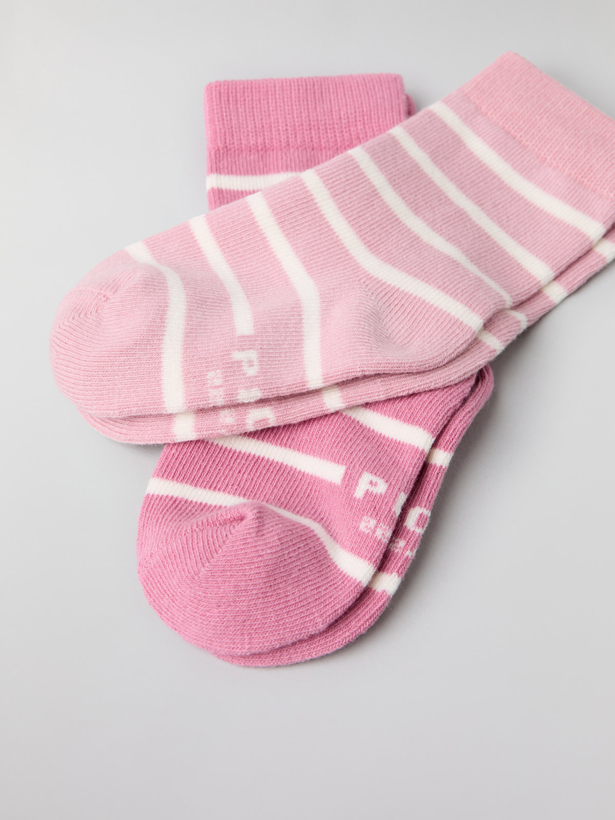 Klassisk stripete sokker i myk økologisk bomull i 2-pakning. Størrelsen er merket på innsiden av skaftet, der det også er plass til å skrive barnets navn, slik at det blir enkelt å holde orden!