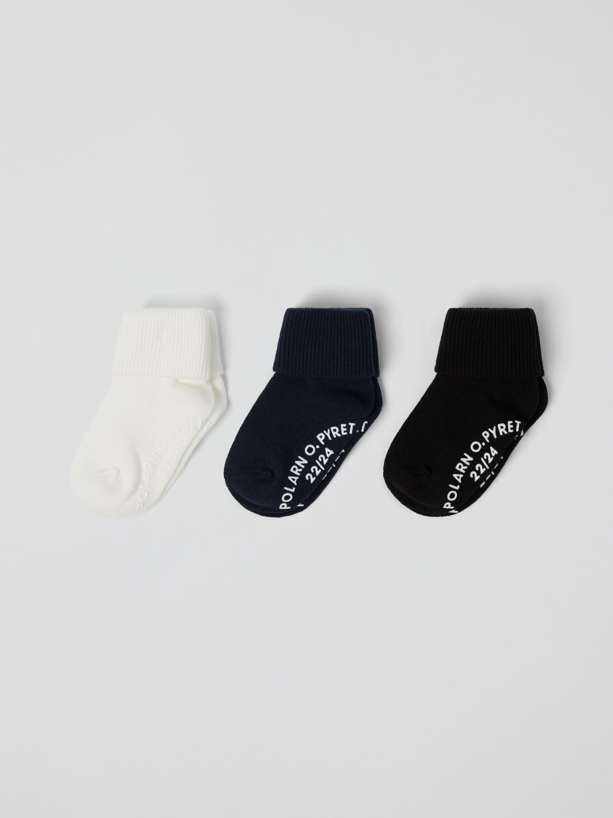 Fyll på sokkeskuffen med tre par ensfargede sokker i myk økologisk bomull til baby. Sokkene har myk vrangbord som kan brettes ned og som ikke gnager.
