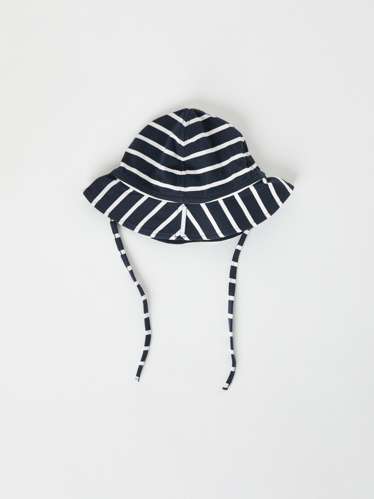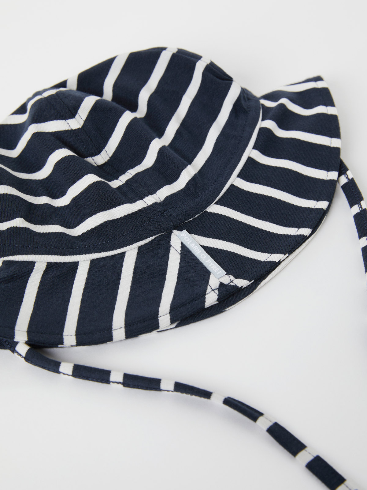 Beskytt babyens følsomme hud med denne stripete solhatten i myk økologisk bomull. Knytebåndet under haken holder solhatten på plass.