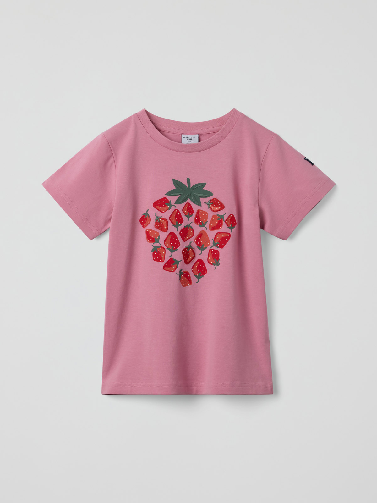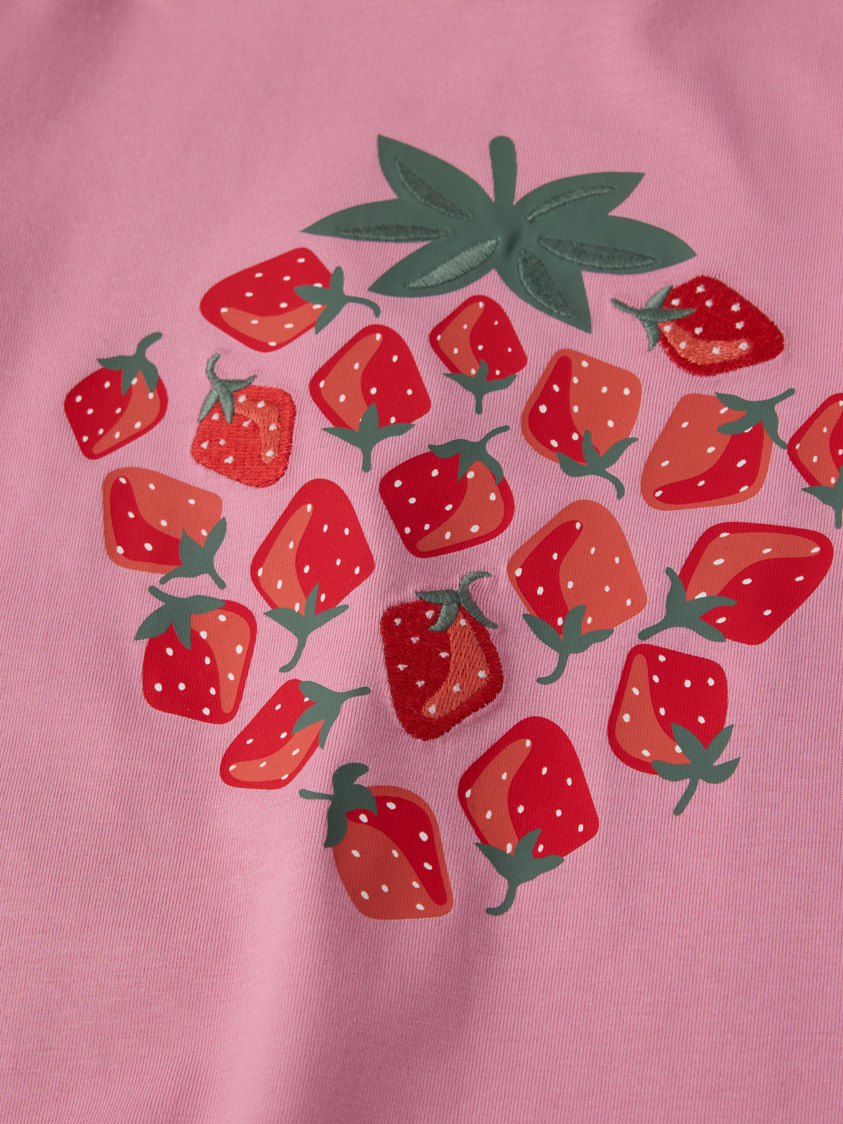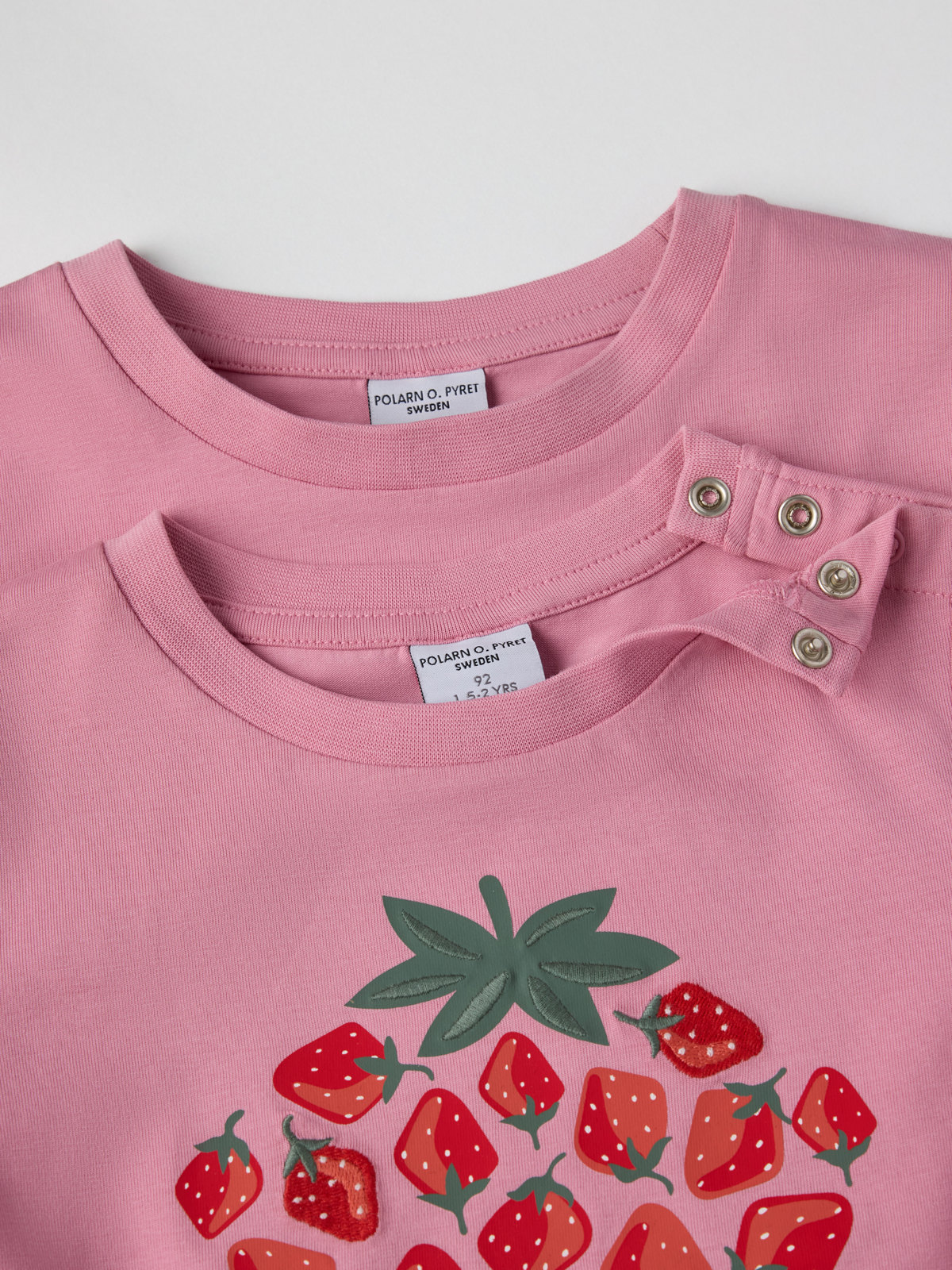 T-skjorte i 100 % økologisk bomull med et festlig trykk med et stort jordbær på forstykket. Morsom å bruke i alle anledninger! T-skjorten finnes i flere farger og trykk som matcher fint med hele kolleksjonen. Finn din favoritt!