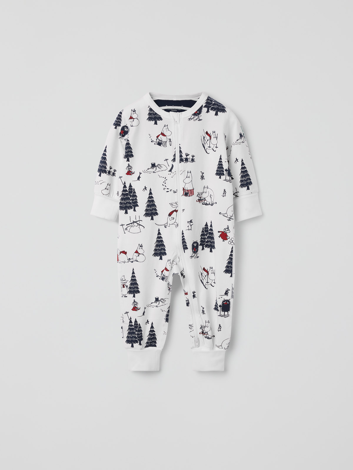 Pysjamasoverall i myk økologisk bomull – en del av vårt kjære designsamarbeid for å feire Mumins 80-årsjubileum 2025. Overallen er heltrykt med illustrasjoner fra Tove Janssons historier om Mummitrollet. Mansjettene ved erme- og benavslutningene er ekstra lange og kan brettes ned etter hvert som barnet vokser. Den lange glidelåsen fra hals til benavslutning kan åpnes både ovenfra og nedenfra for å gjøre klesskift enklere.