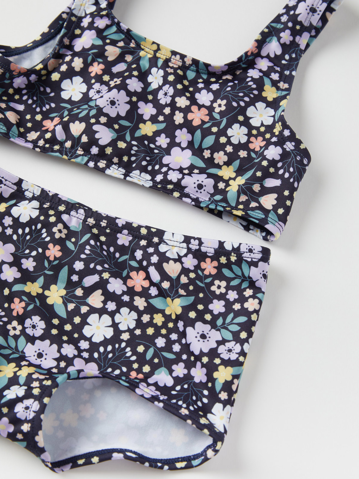Behagelig bikini i 100 % resirkulert polyester, helmønstret med små blomster. Underdelen er en hipstermodell med høy midje. Overdelen er en rett modell med brede skulderstropper.