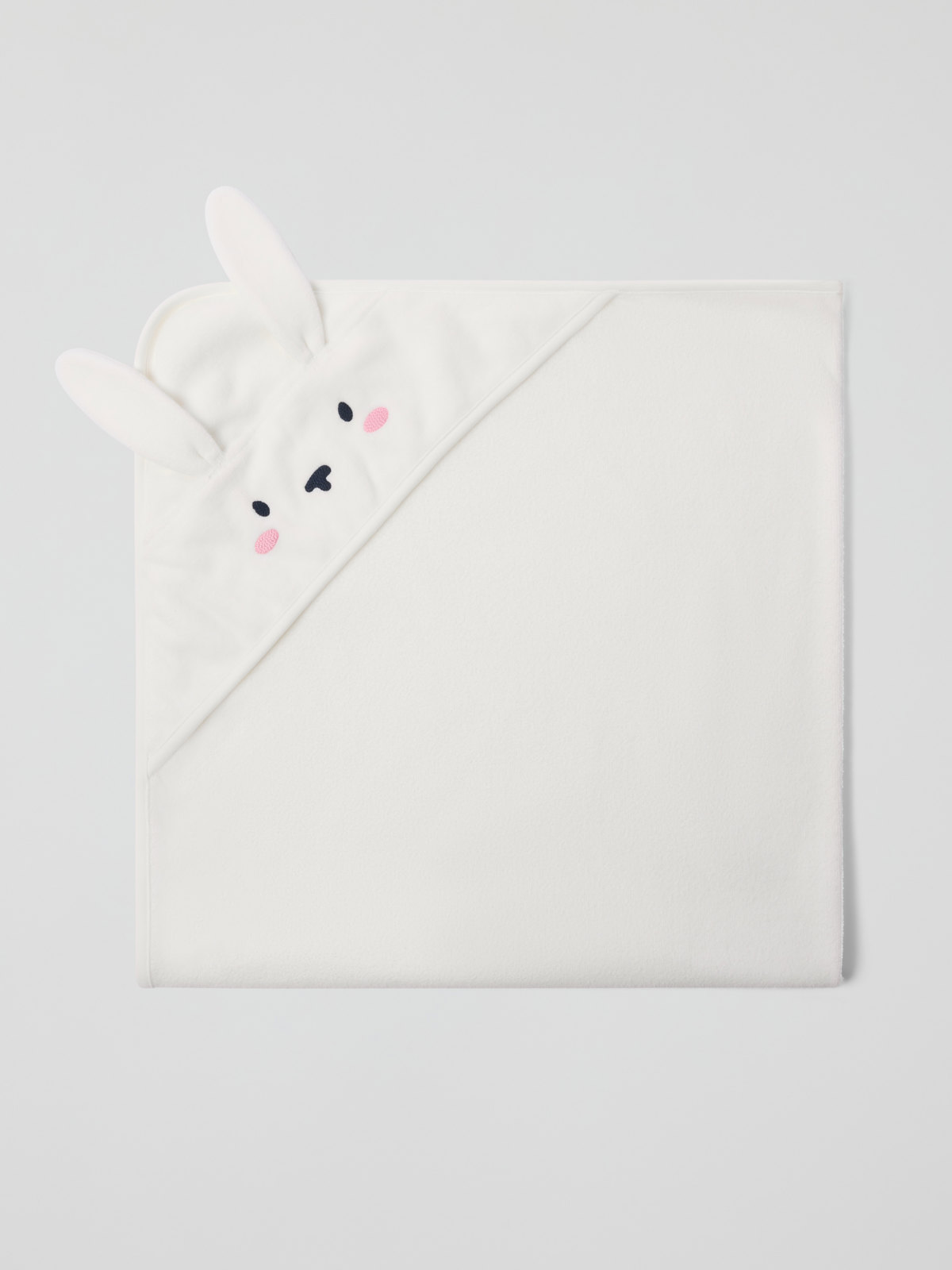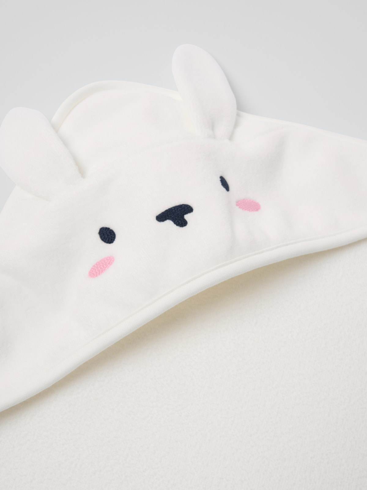 Håndkleet er laget av myk bomullsfrotté og har en praktisk liten hette i det ene hjørnet som passer små hoder og holder håndkleet på plass. Hettepartiet har et brodert kaninansikt og påsydde små ører.