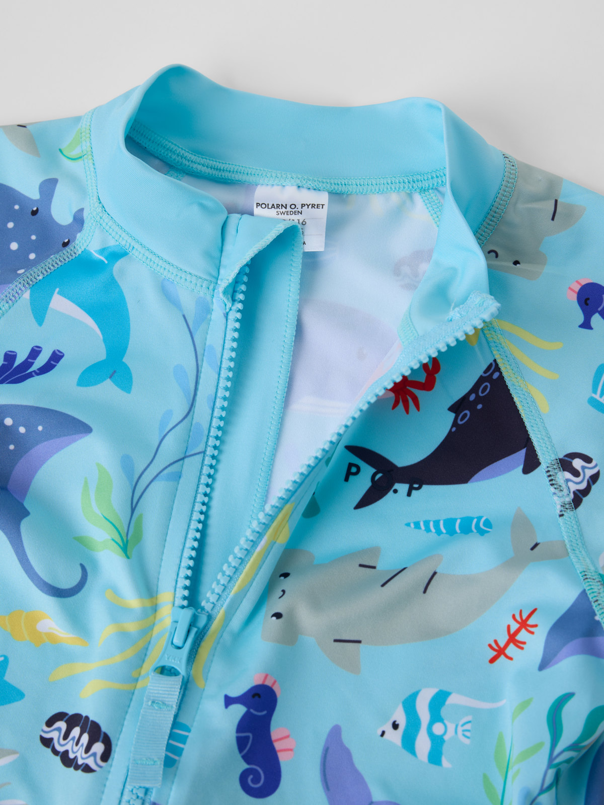 UV-drakt med UPF 50 laget av mykt og behagelig materiale i resirkulert polyester. UV-drakten har ekstra myke sømmer som ikke gnager. Glidelåsen foran gjør den enkel å ta av og på, og har en beskyttelse øverst for å unngå gnissing mot hake og kinn.
