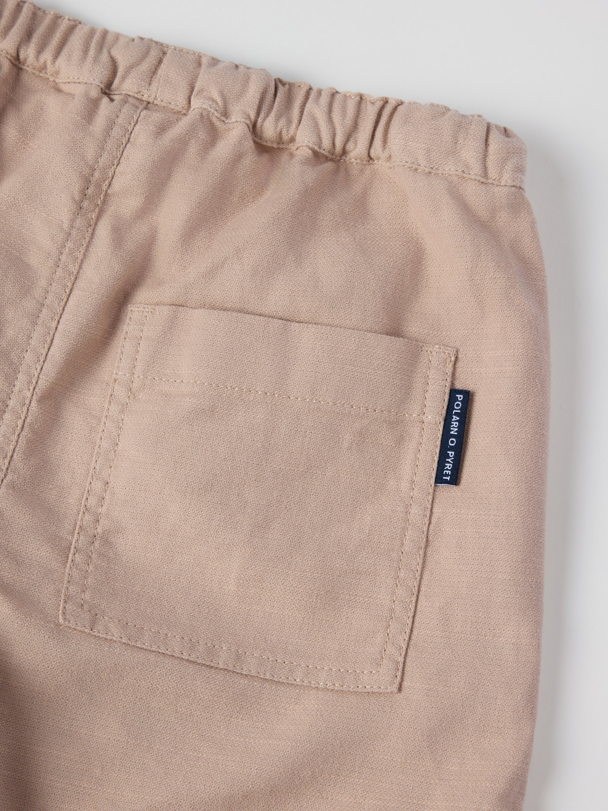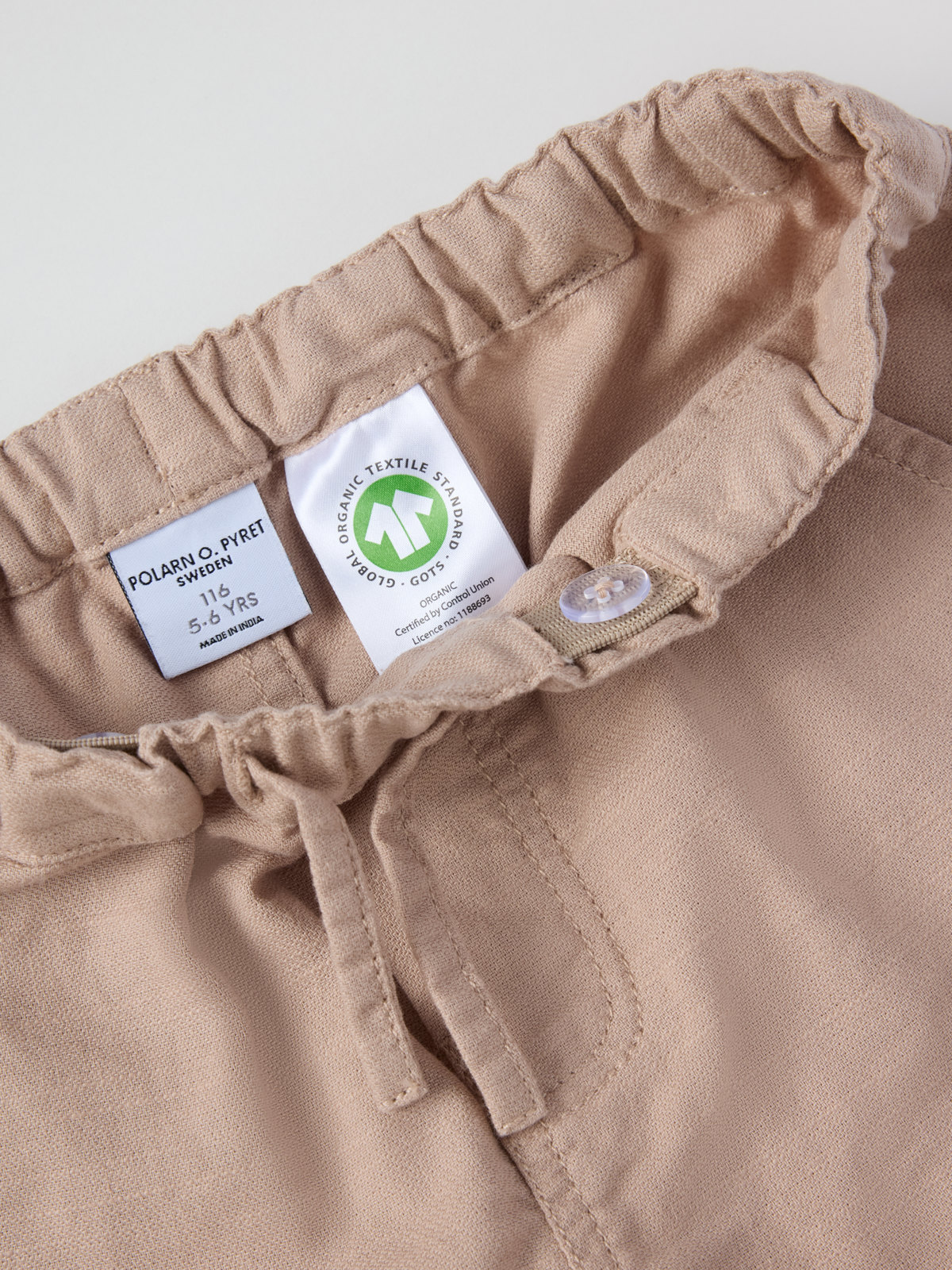 Ensfarget shorts i økologisk bomull med linfølelse – fin til både hverdag og fest. Shortsen har elastisk midje som kan reguleres med knytebånd, og to lommer foran.