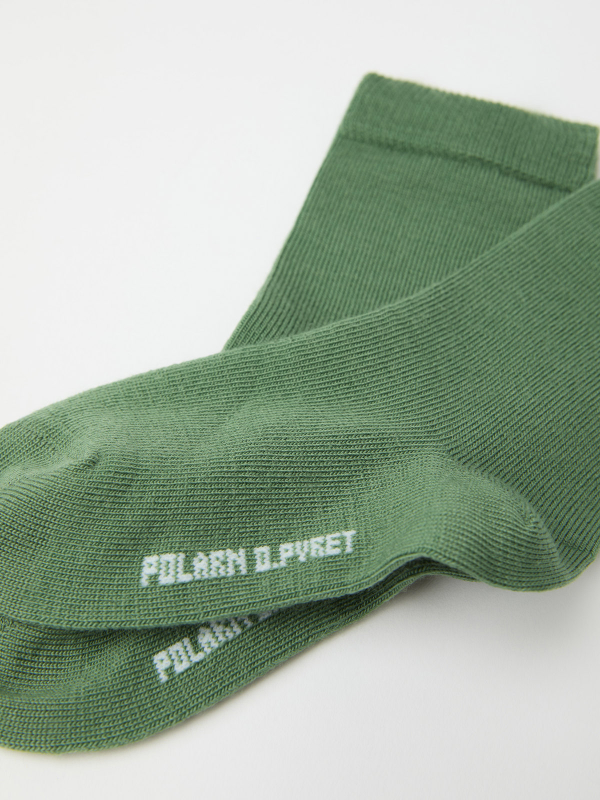 Ensfargede sokker i tynn merinoull som varmer godt og er myke for små føtter. Størrelsen er angitt på innsiden av skaftet. Der er det også plass til å skrive barnets navn. Lett å holde orden!