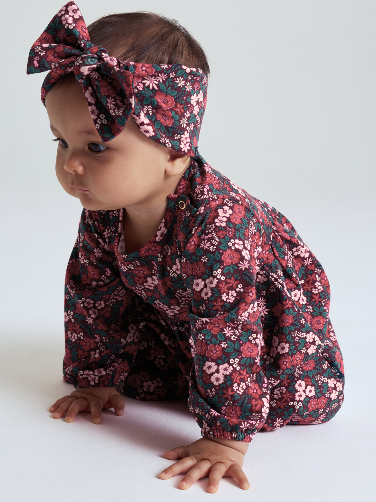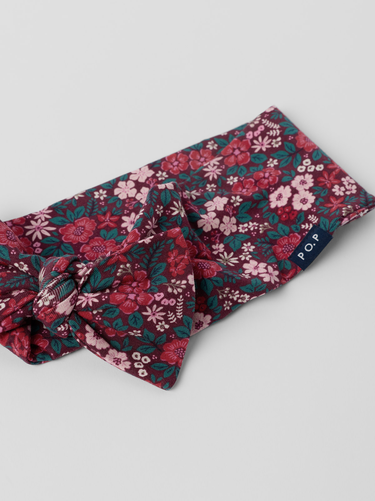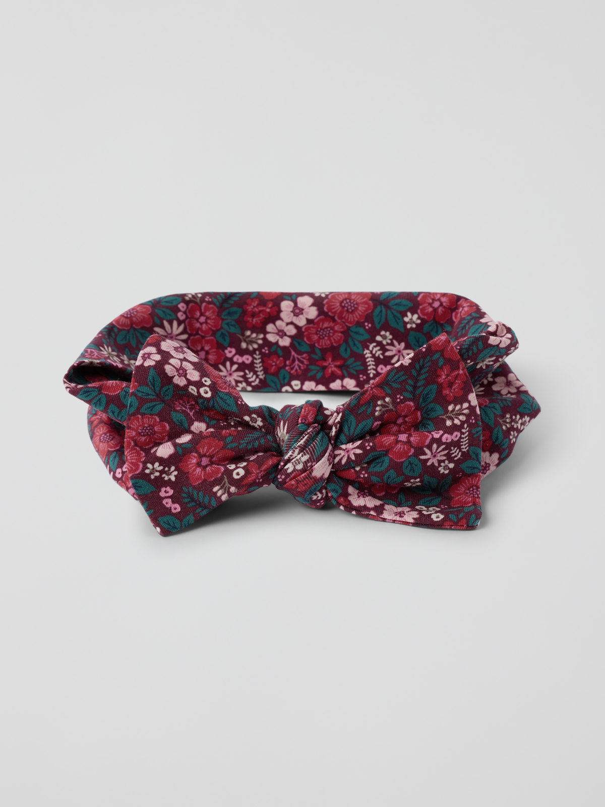 Elastiskt hårbånd i myk økologisk bomullstrikot. Hårbåndet er helmønstret med blomster og pyntet med en fin sløyfe.