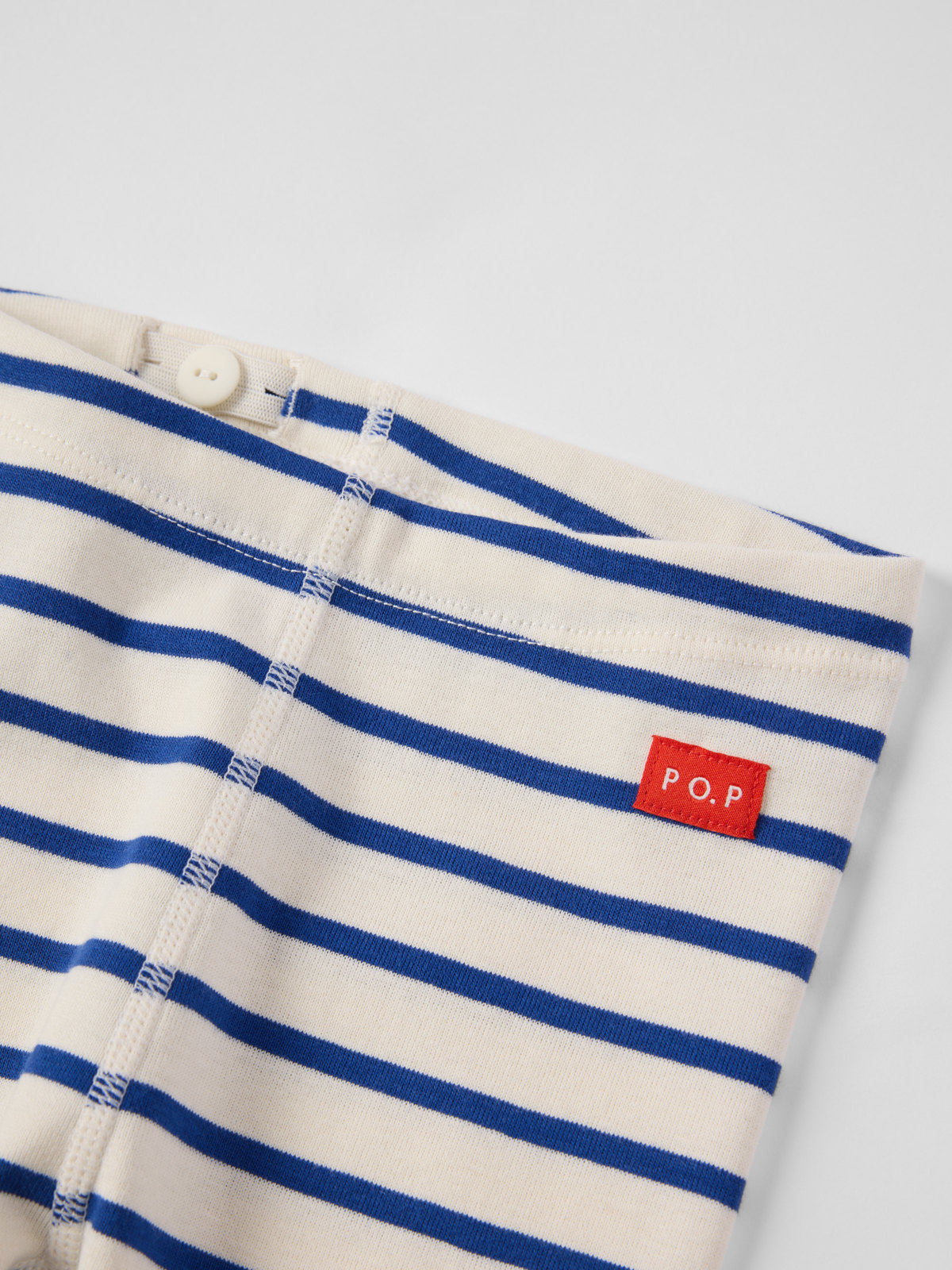 Ribbestrikket bukse i myk økologisk bomull for baby. Et perfekt basisplagg som passer både hjemme og i barnehagen! Buksen har vår klassiske stripe og elastisk midje som kan justeres med knapphullstrikk. Den har også myke mansjetter nederst på bena.