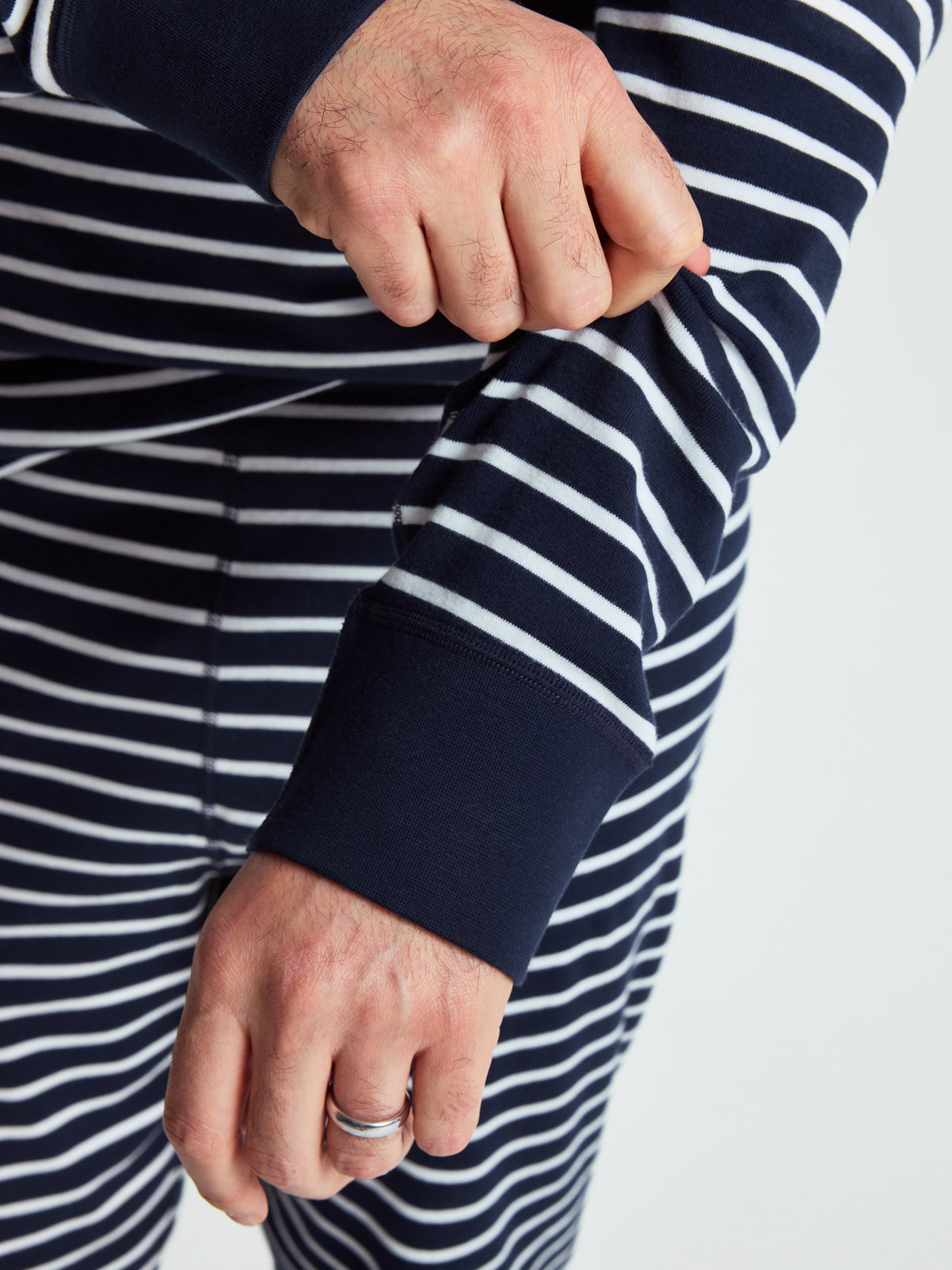 Stripet genser i 100 % økologisk bomull. Genseren har våre klassiske striper og myk ribbestrikket vrangbord nederst på ermene.