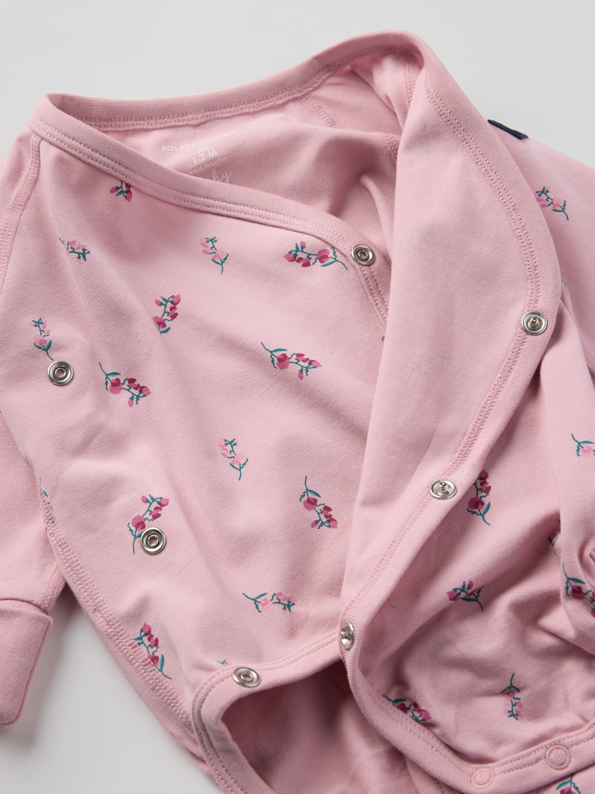 Forlengbar omslagsbody i 100 % økologisk bomull. Den smarte løsningen med en ekstra rad trykknapper i skrittet og nedbrettbar vrangbord nederst på ermene gjør at bodyen kan vokse med babyen!