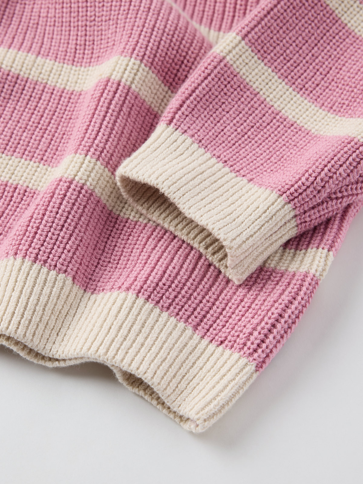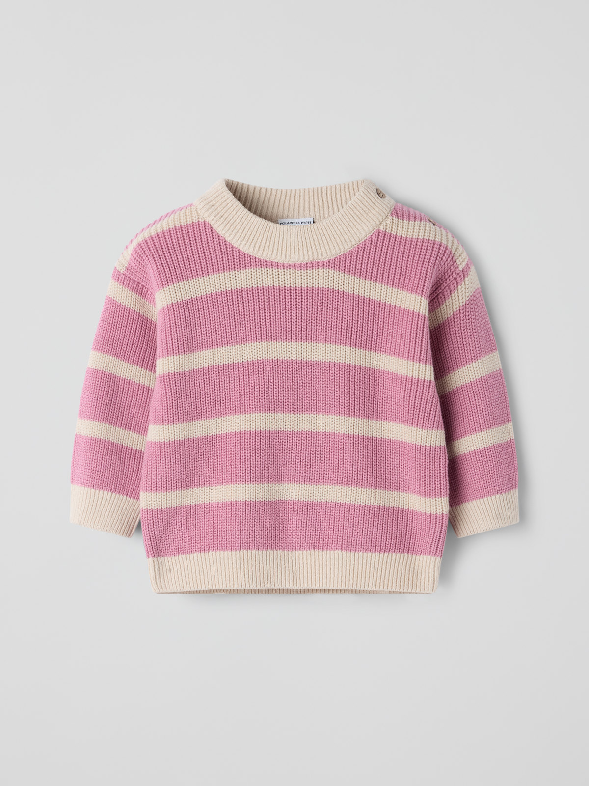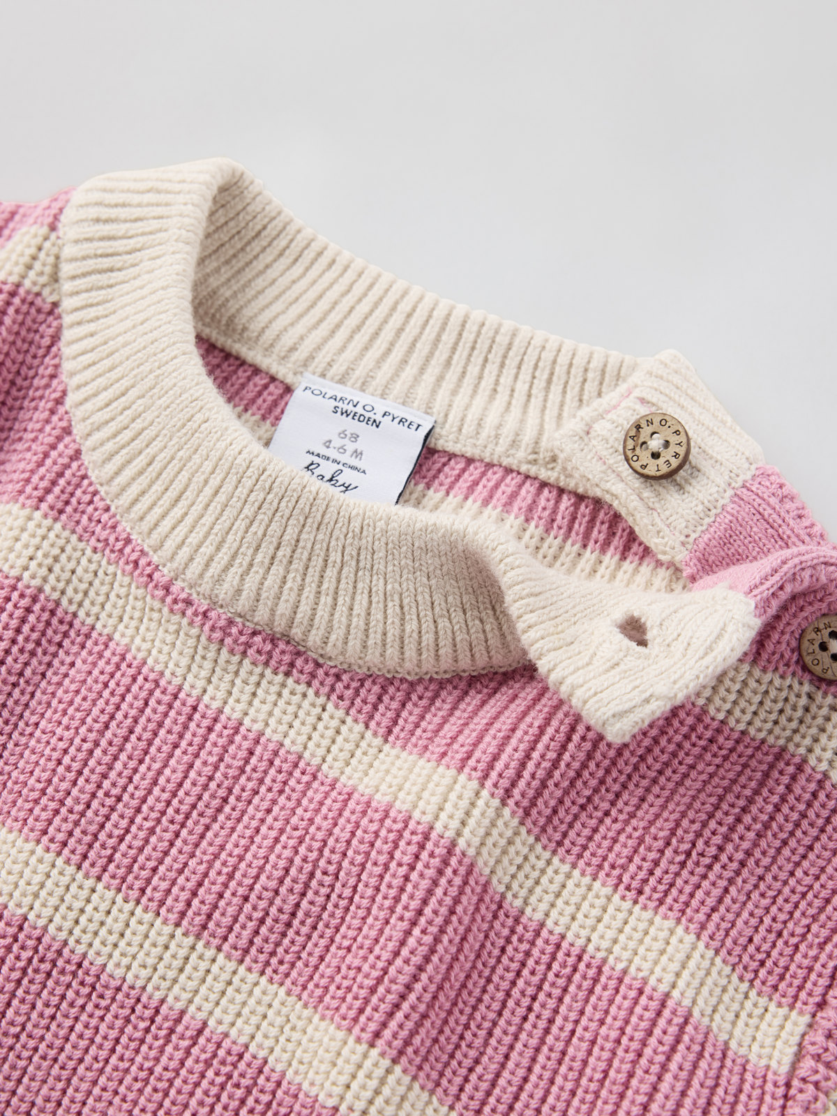 Strikket genser i 100 % økologisk bomull. En skikkelig deilig høstfavoritt. Genseren har ribbestrikket vrangbord i halsringningen og nederst på ermene.