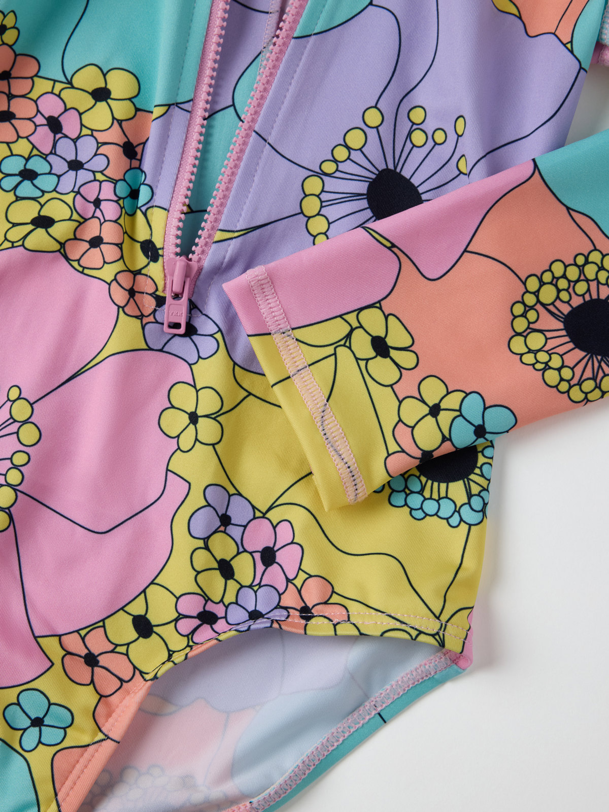 Langermet badedrakt fremstilt i mykt og behagelig materiale av resirkulert polyester – perfekt for den som liker å bade lenge! Badedrakten har en smart glidelås foran og er helmønstret med blomster.