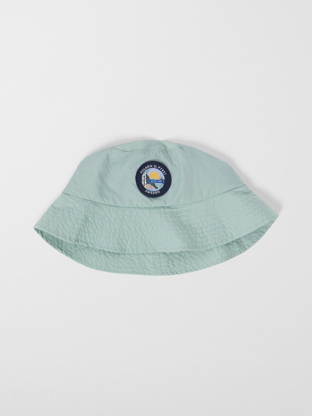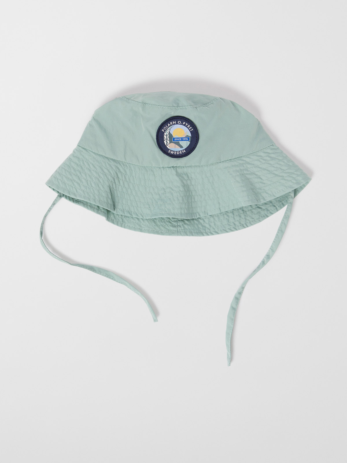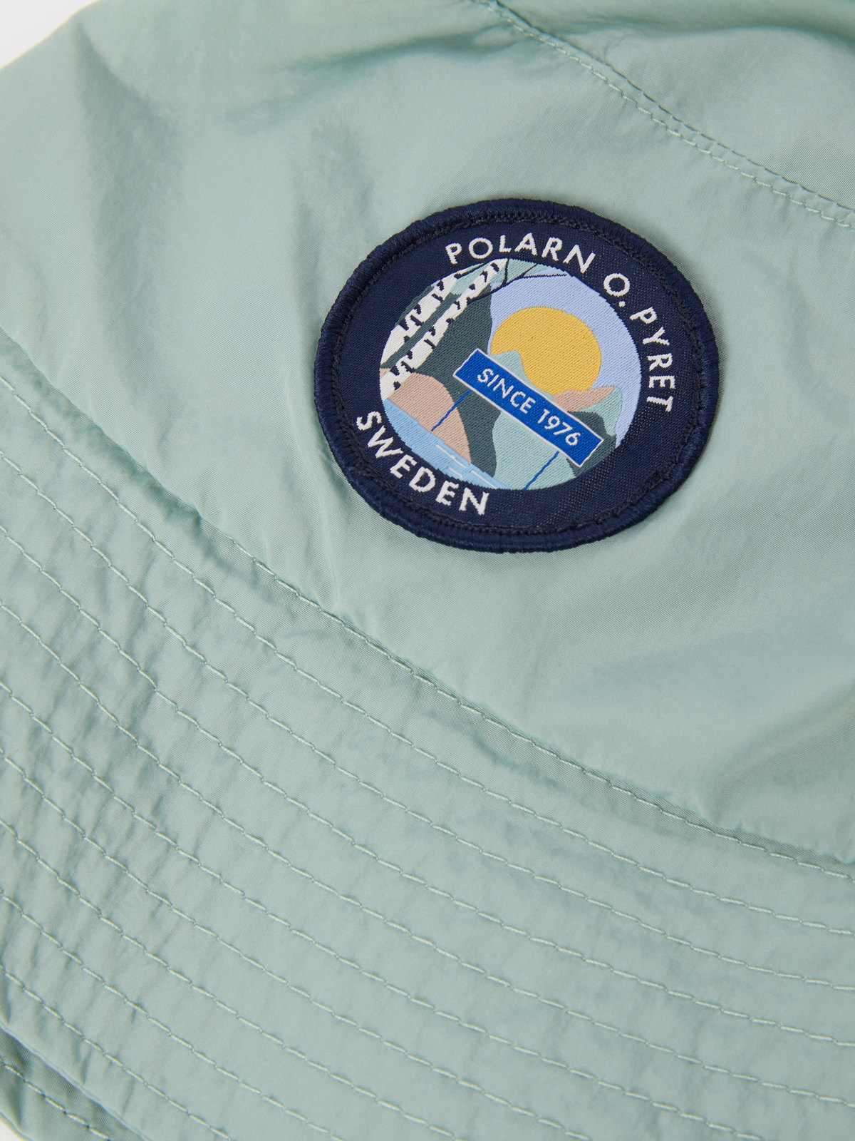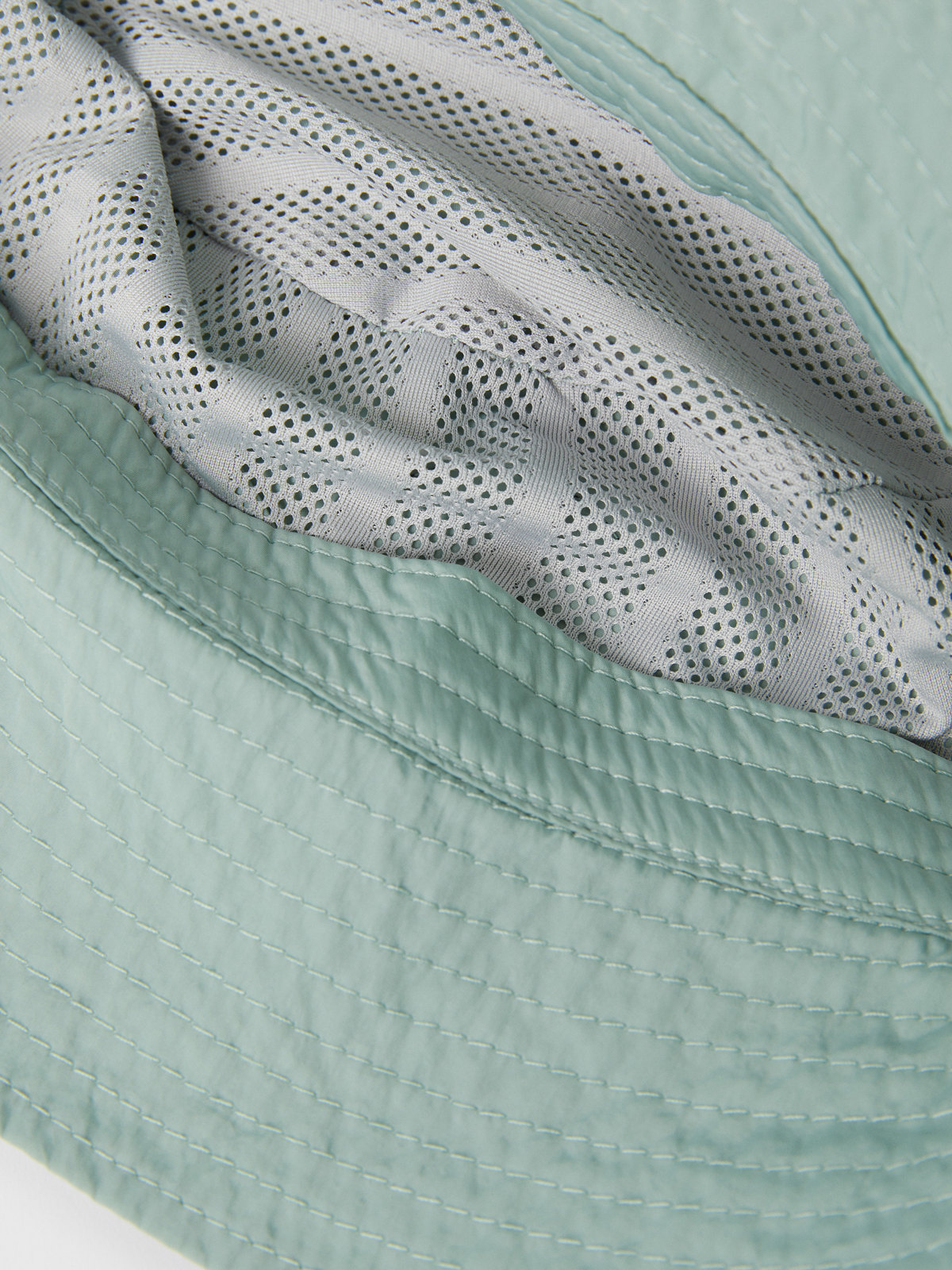 Hatten er fremstilt i resirkulert nylon og har broderte ventilasjonshull samt en dekorativ applikasjon foran.