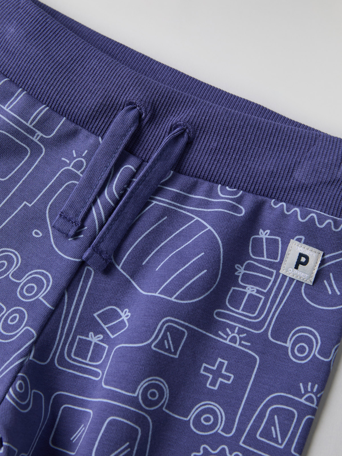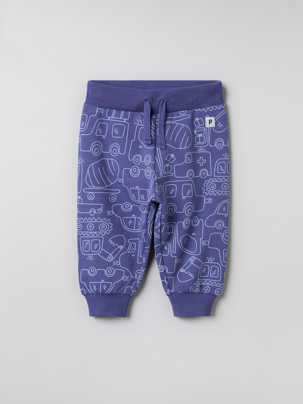 Buksen er helmønstret med biler og har ribbestrikket vrangbord i midjen og nederst på bena. Midjen kan også reguleres med knytebånd.