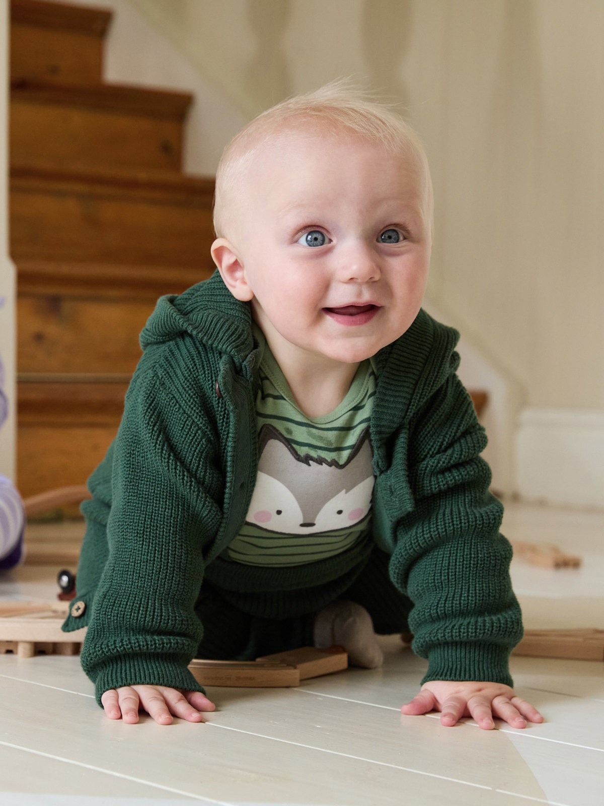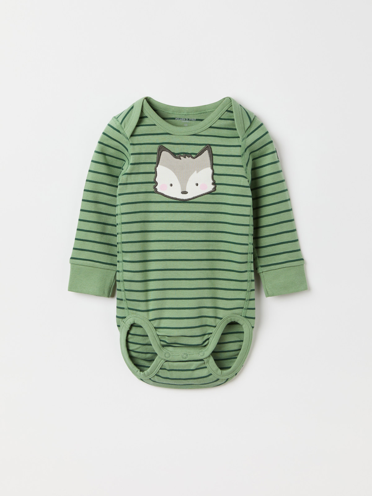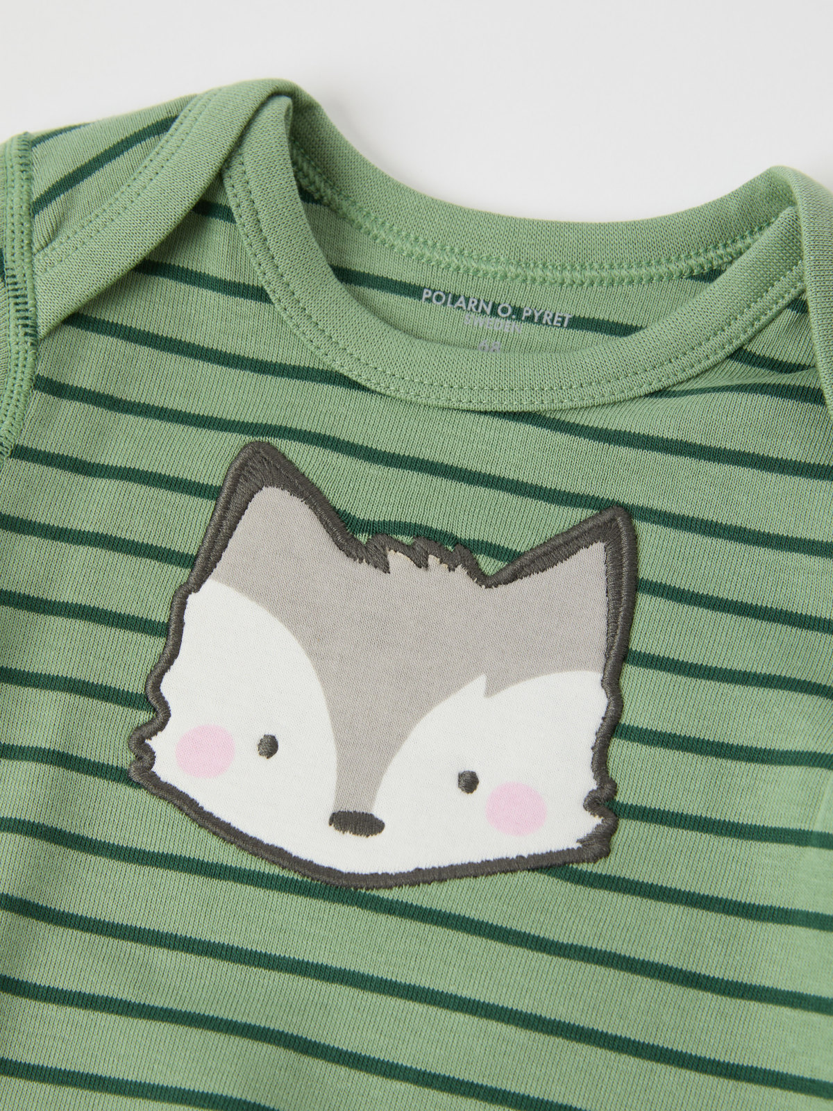 Bodyen har et ulveansikt på forstykket og omslagsskuldre som gjør den enkel å træ over babyens hode. Den har også en myk vrangbord nederst på ermene.