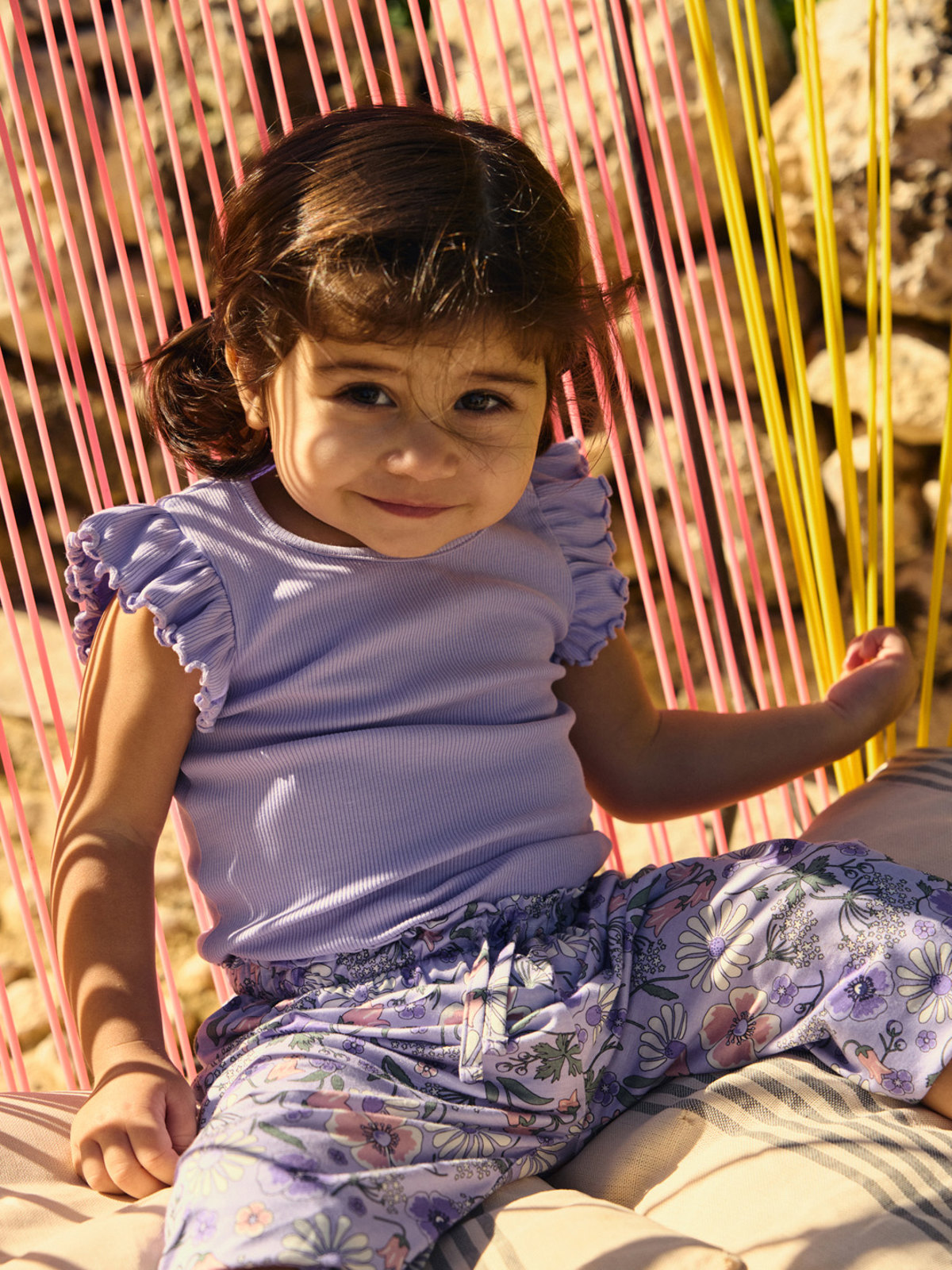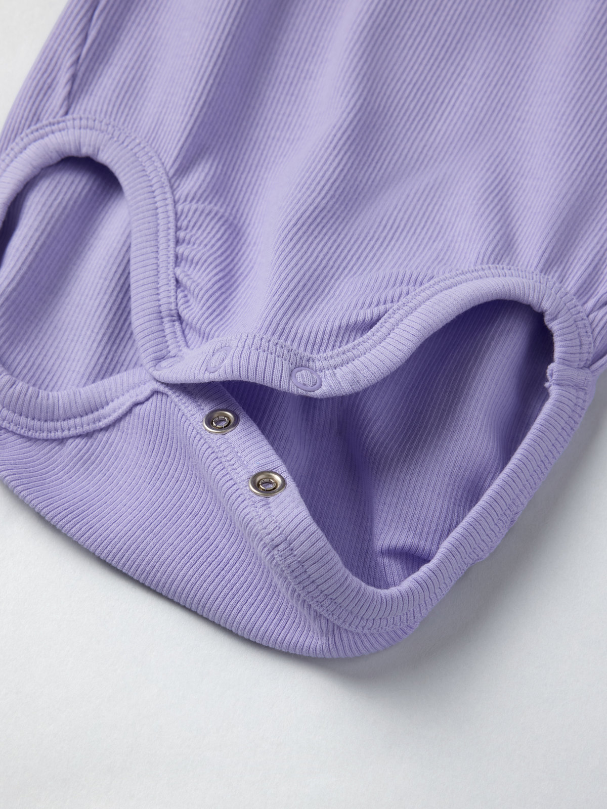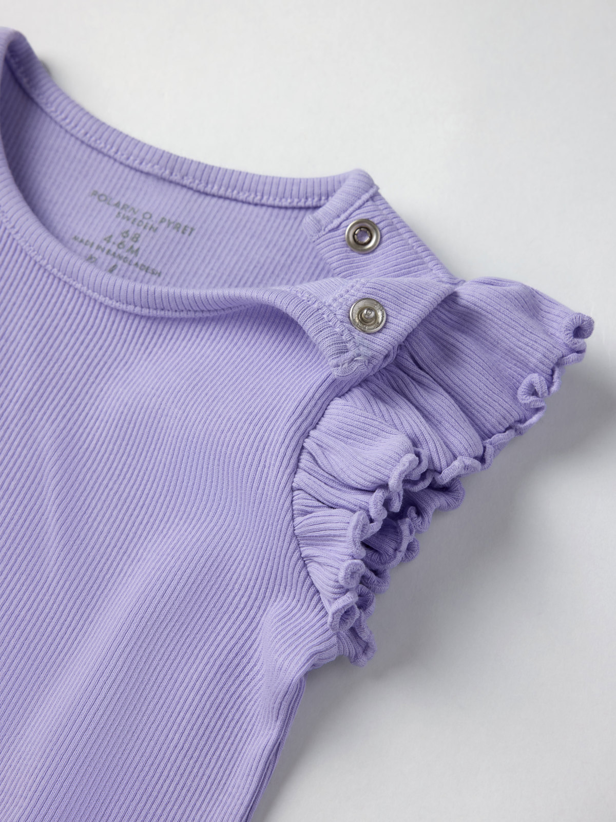 Ribbestrikket trikotbody i myk økologisk bomull med søte volanger til baby. Bodyen har ekstra myke, flate sømmer som er skånsomme mot den følsomme babyhuden.