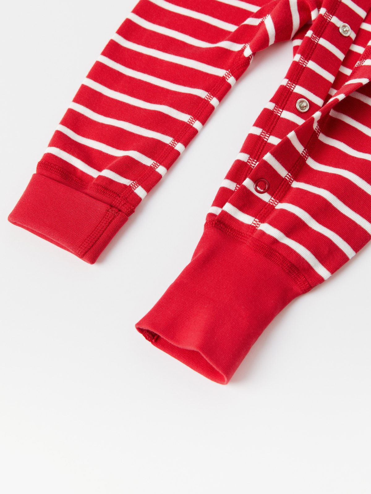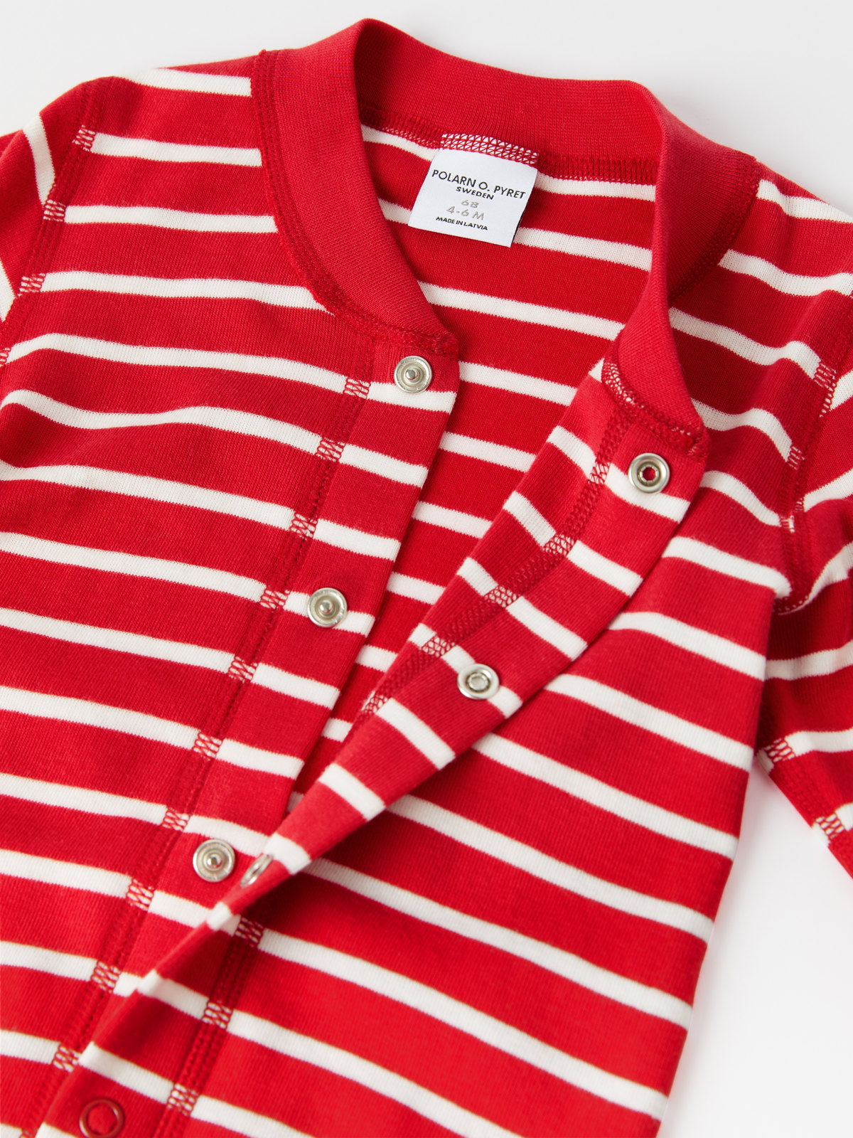 Dress til nyfødt i økologisk bomull og med Polarn O. Pyret-striper. Trykknapper fra hals til benslutt gjør den lett å ta av og på. Mansjetter som kan brettes ned ettersom barnet vokser.