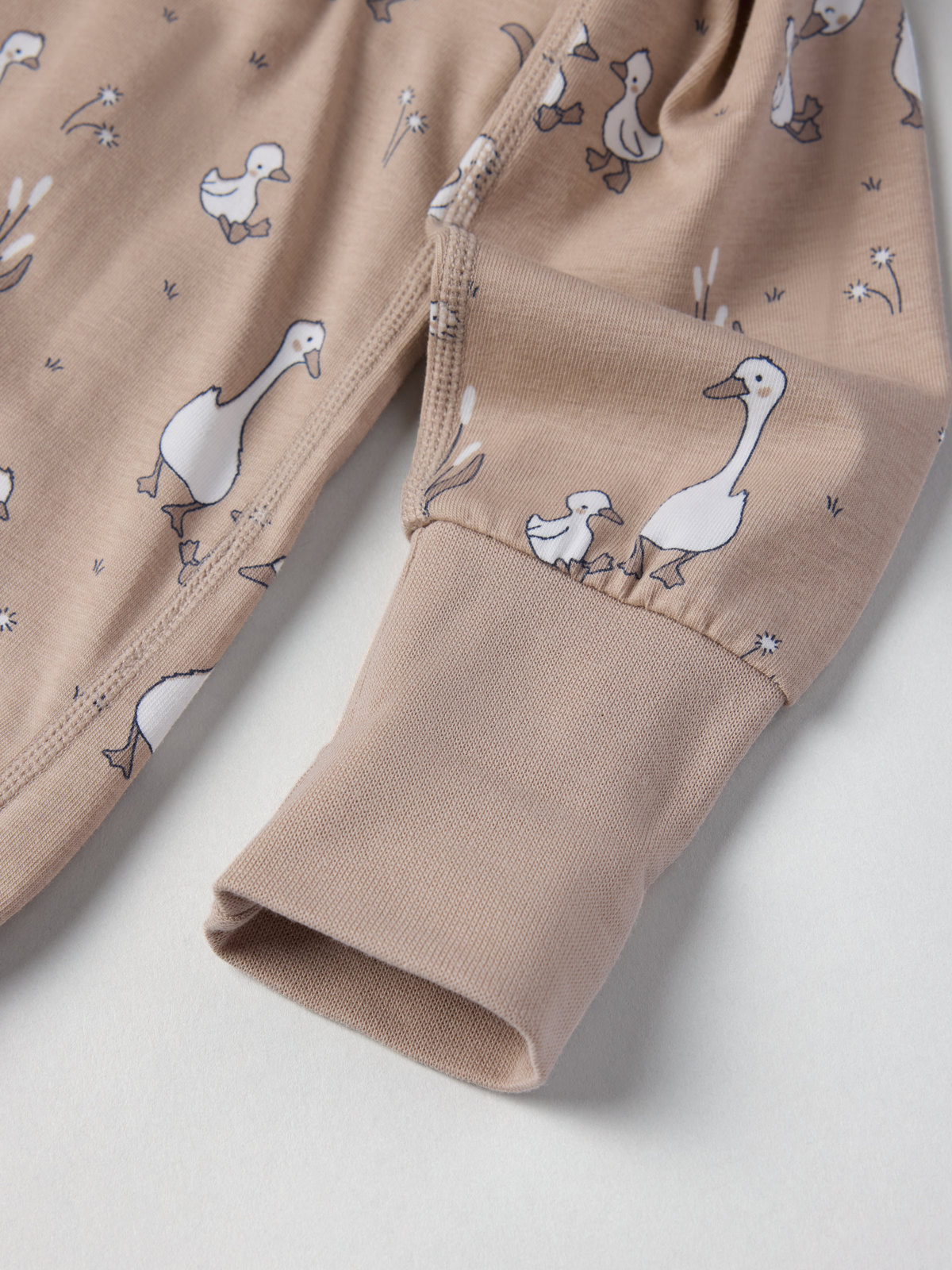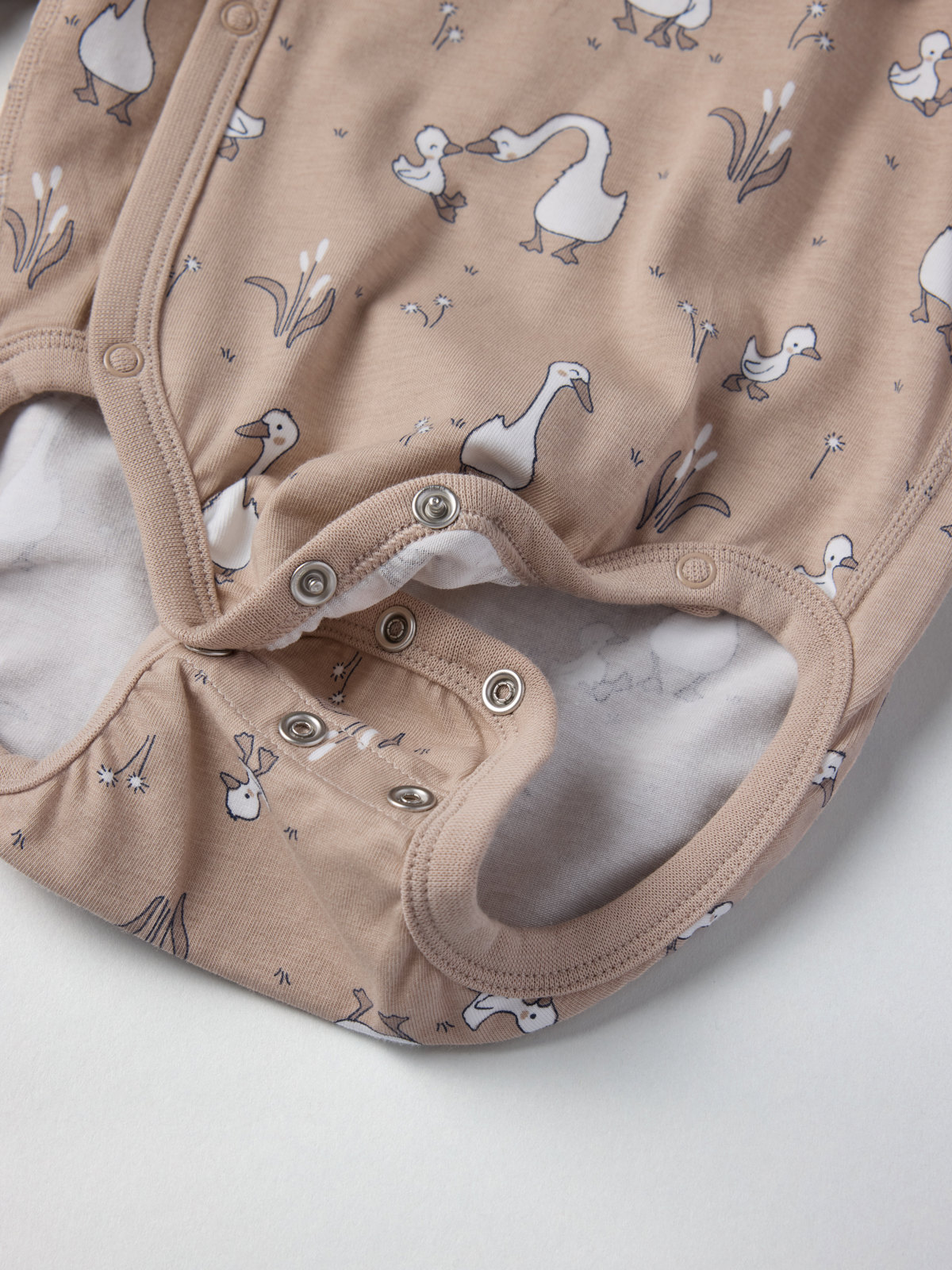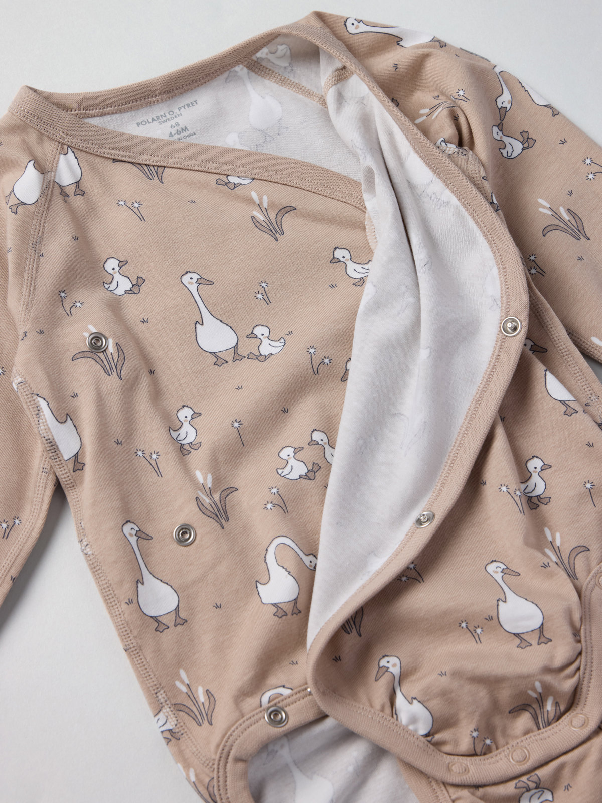 Forlengbar omslagsbody i 100 % økologisk bomull, helmønstret med gjess. Den smarte løsningen med en ekstra rad trykknapper i skrittet og nedbrettbare vrangborder nederst på ermene gjør at bodyen kan vokse med babyen!