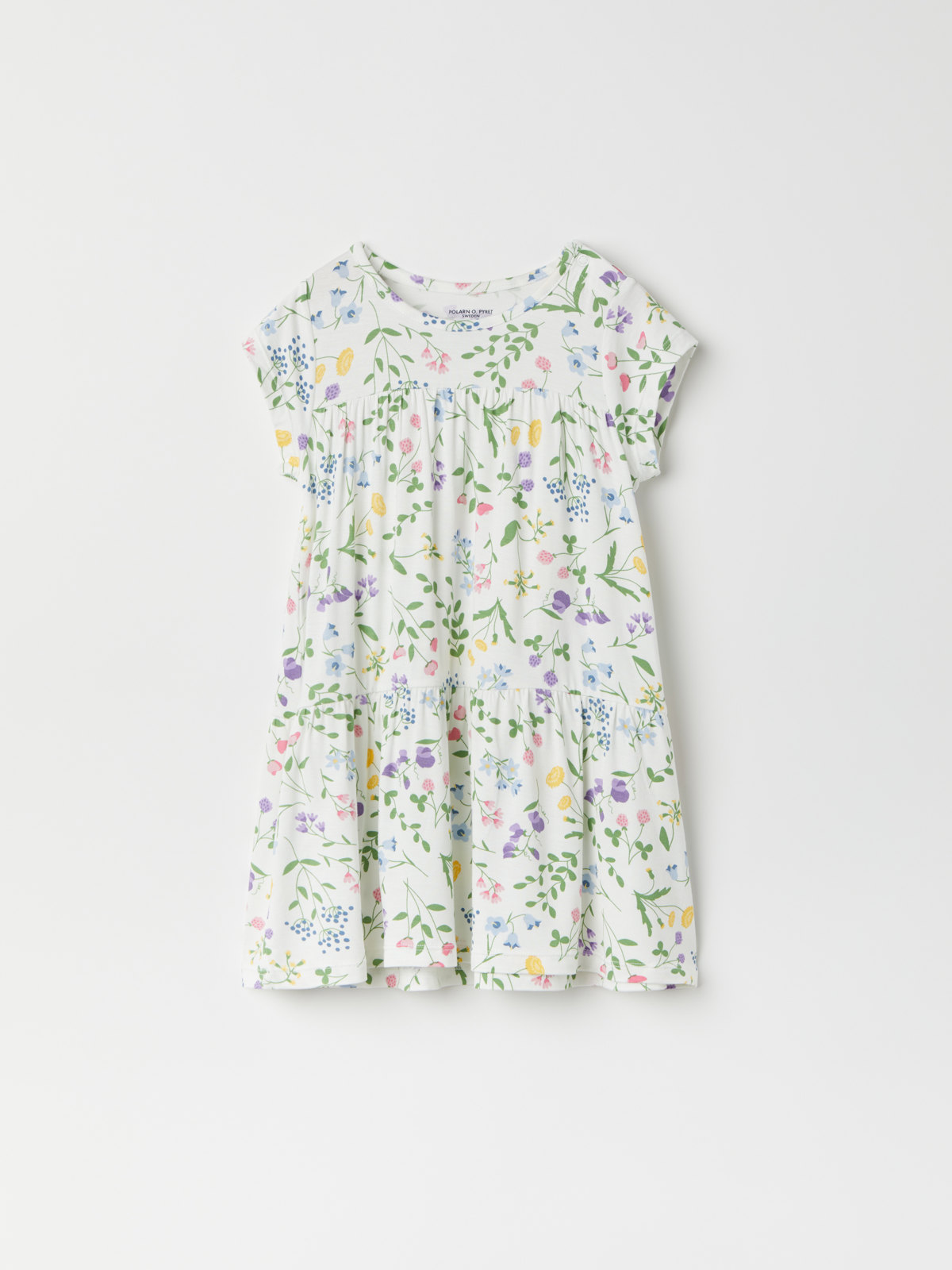 Kjolen har korte ermer og trykknapper på den ene skulderen for enklere klesskift.