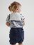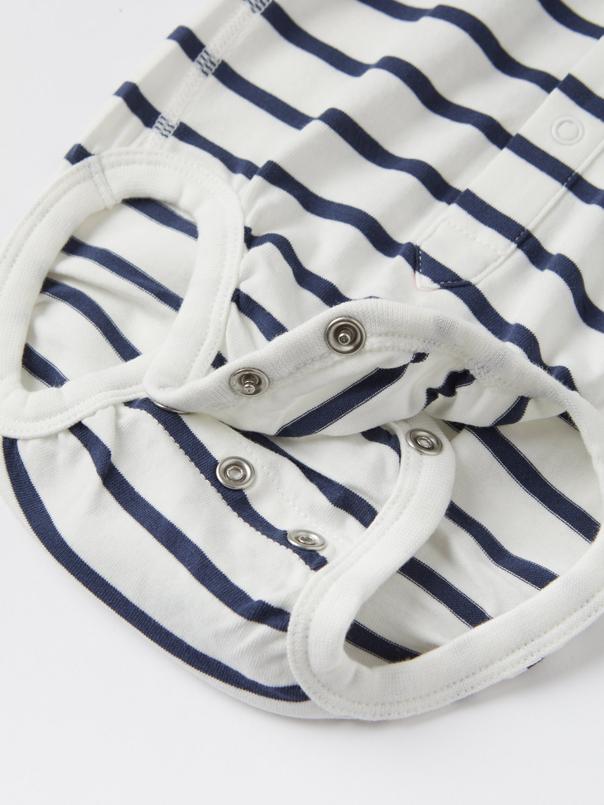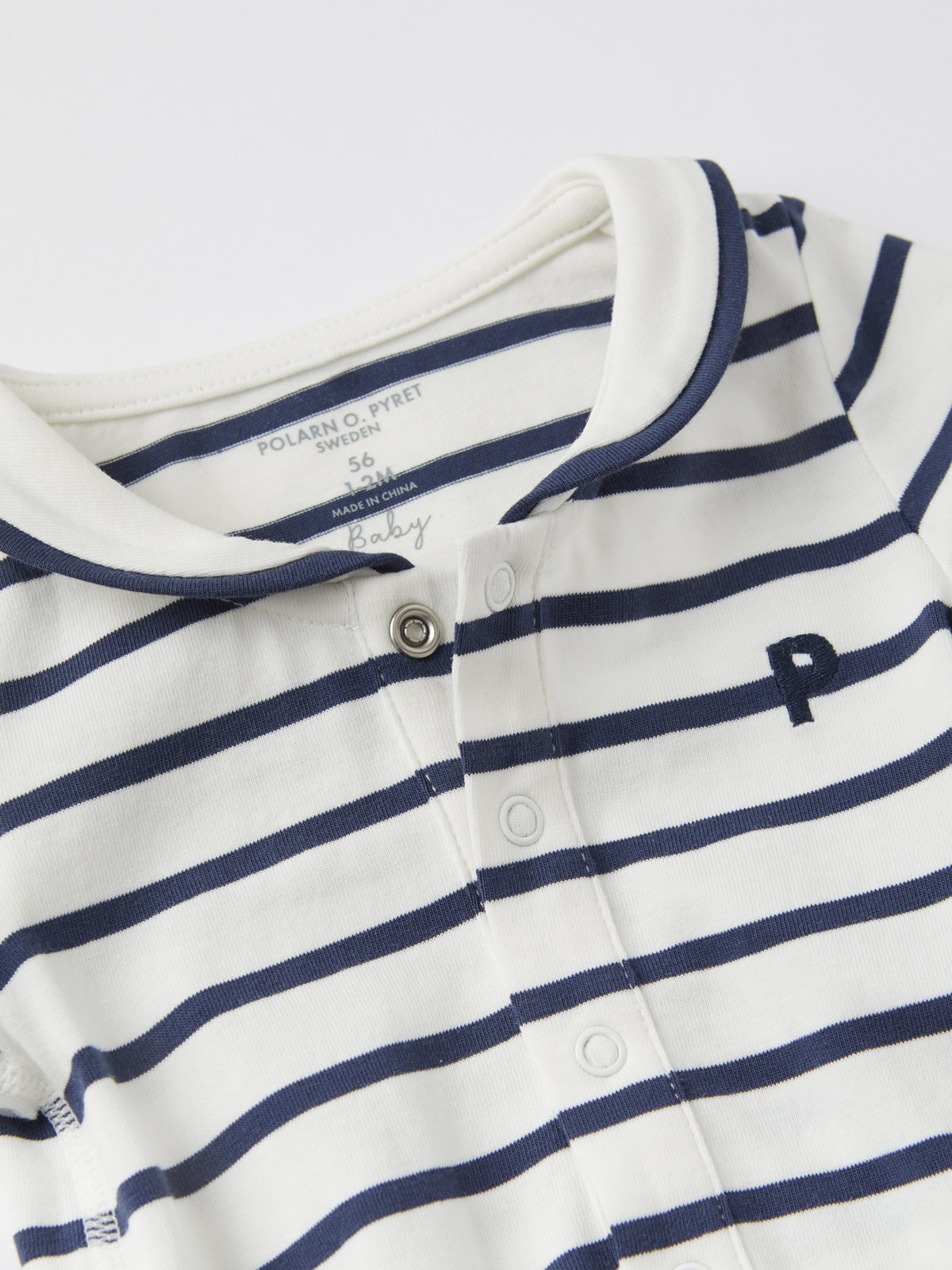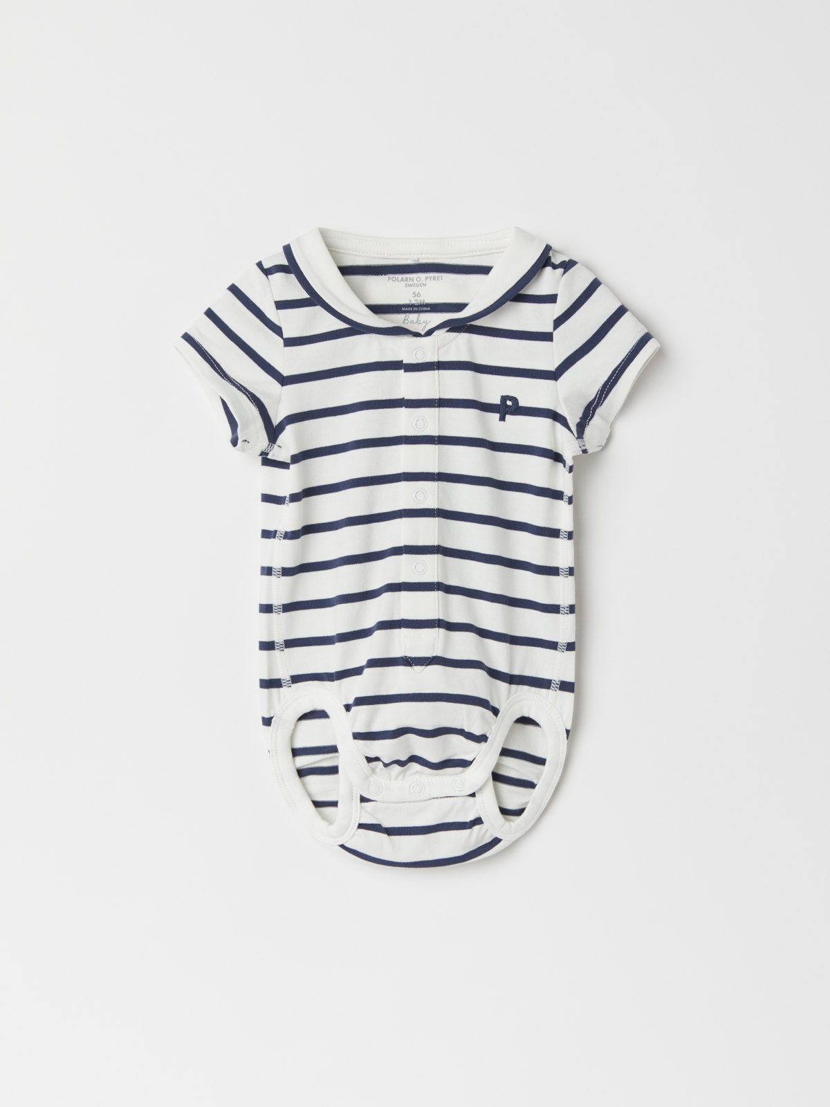 Sjømannsbody i myk økologisk bomullstrikot til baby – fin til sommerens båtturer eller festligheter.