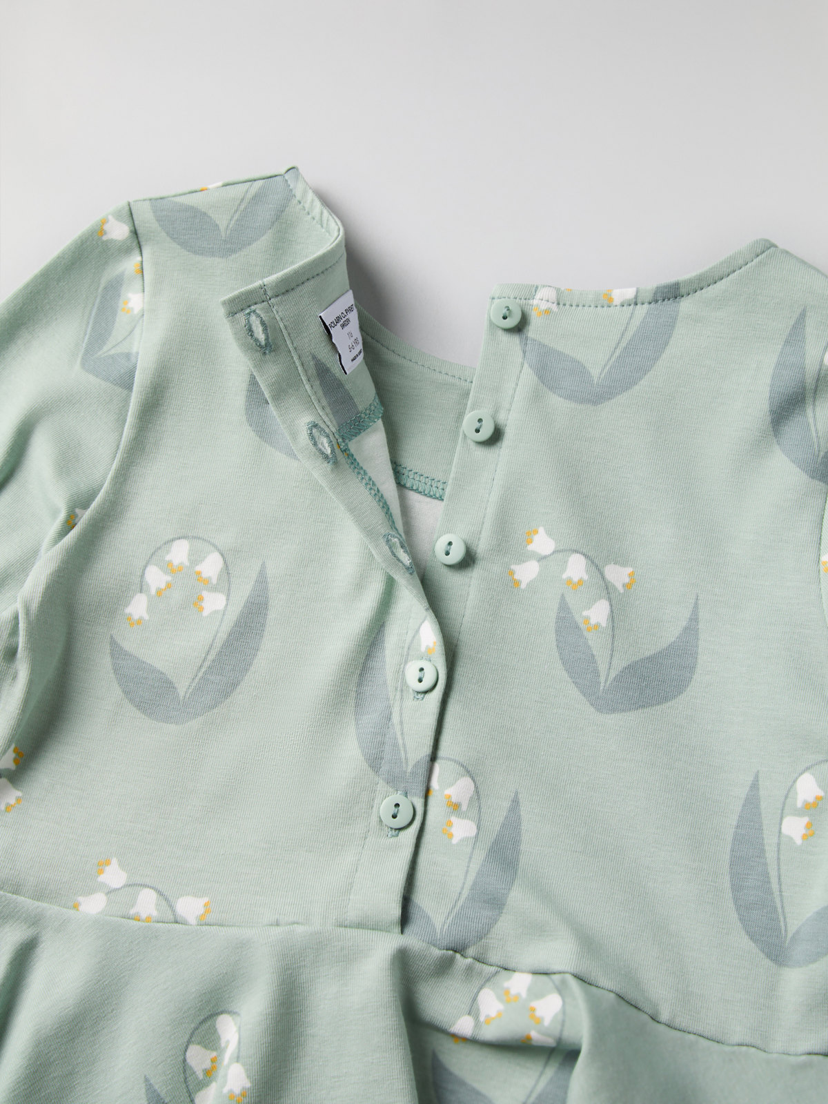 Kjolen er helmønstret med blomster og lukkes med knappestolpe bak på ryggen.