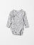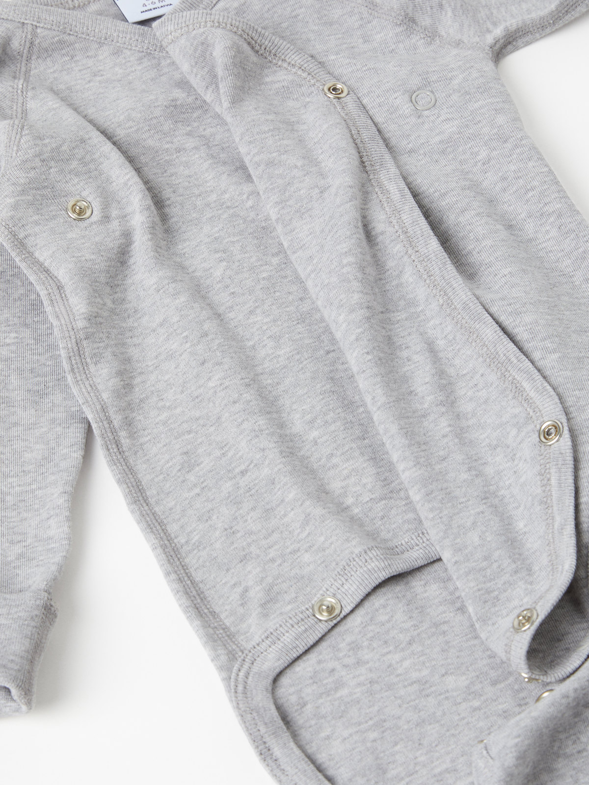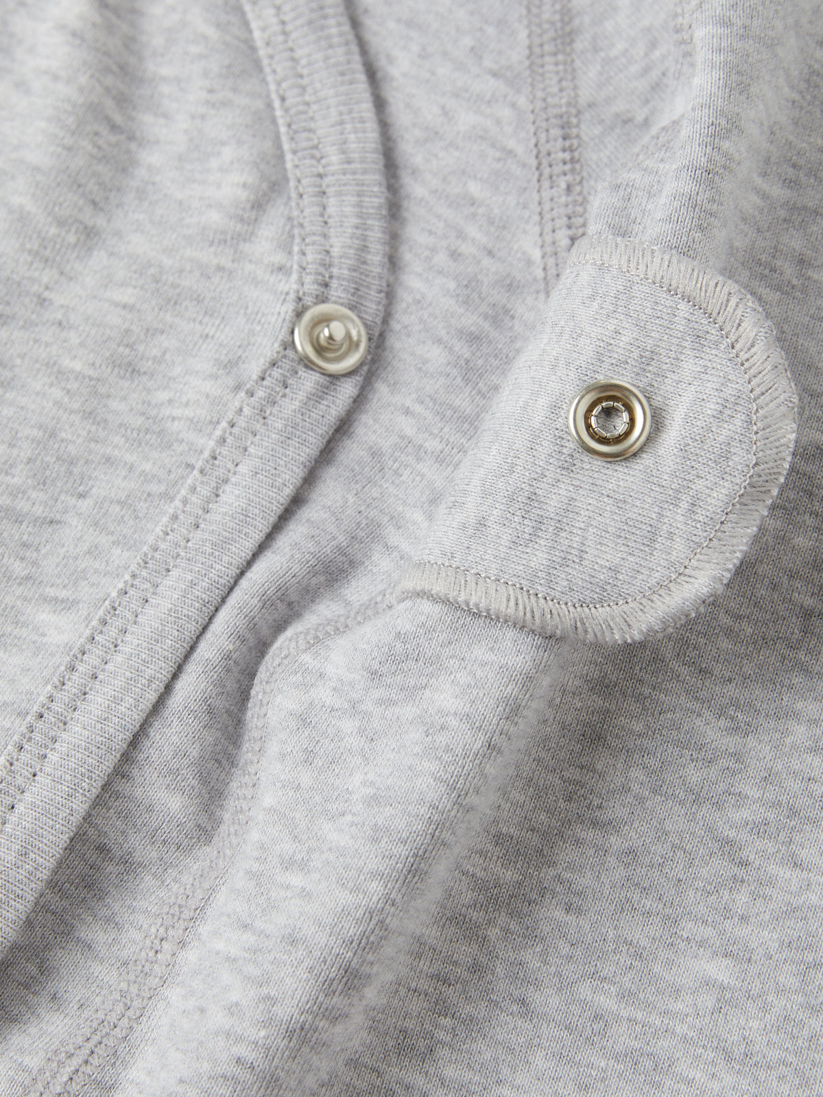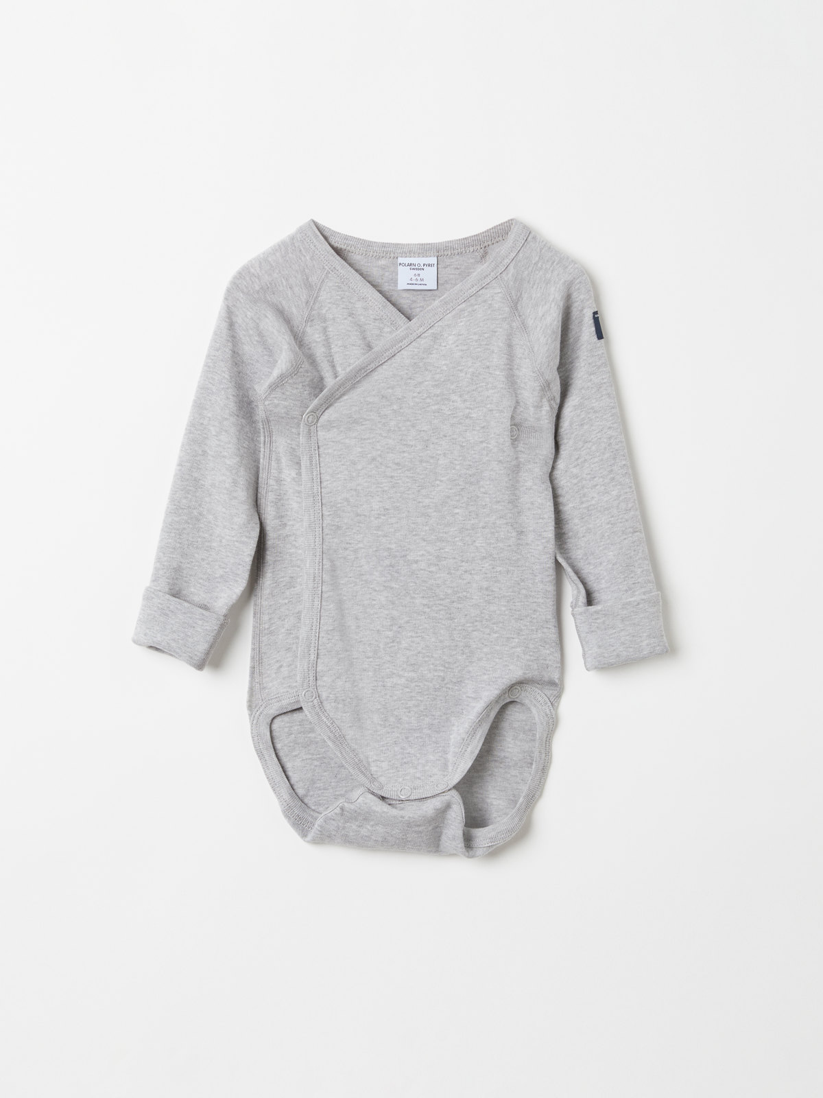 Omslagsbody i økologisk bomull til nyfødt. Bodyen har våre klassiske striper og myk, ribbestrikket vrangbord nederst på ermene, som kan brettes ned etter hvert som babyen vokser. Trykknappene langs omslagsåpningen og i skrittet gir enklere kles- og bleieskift.