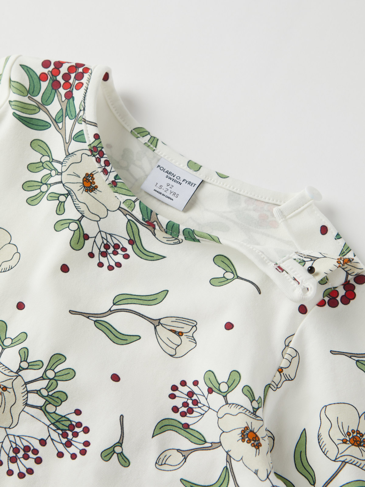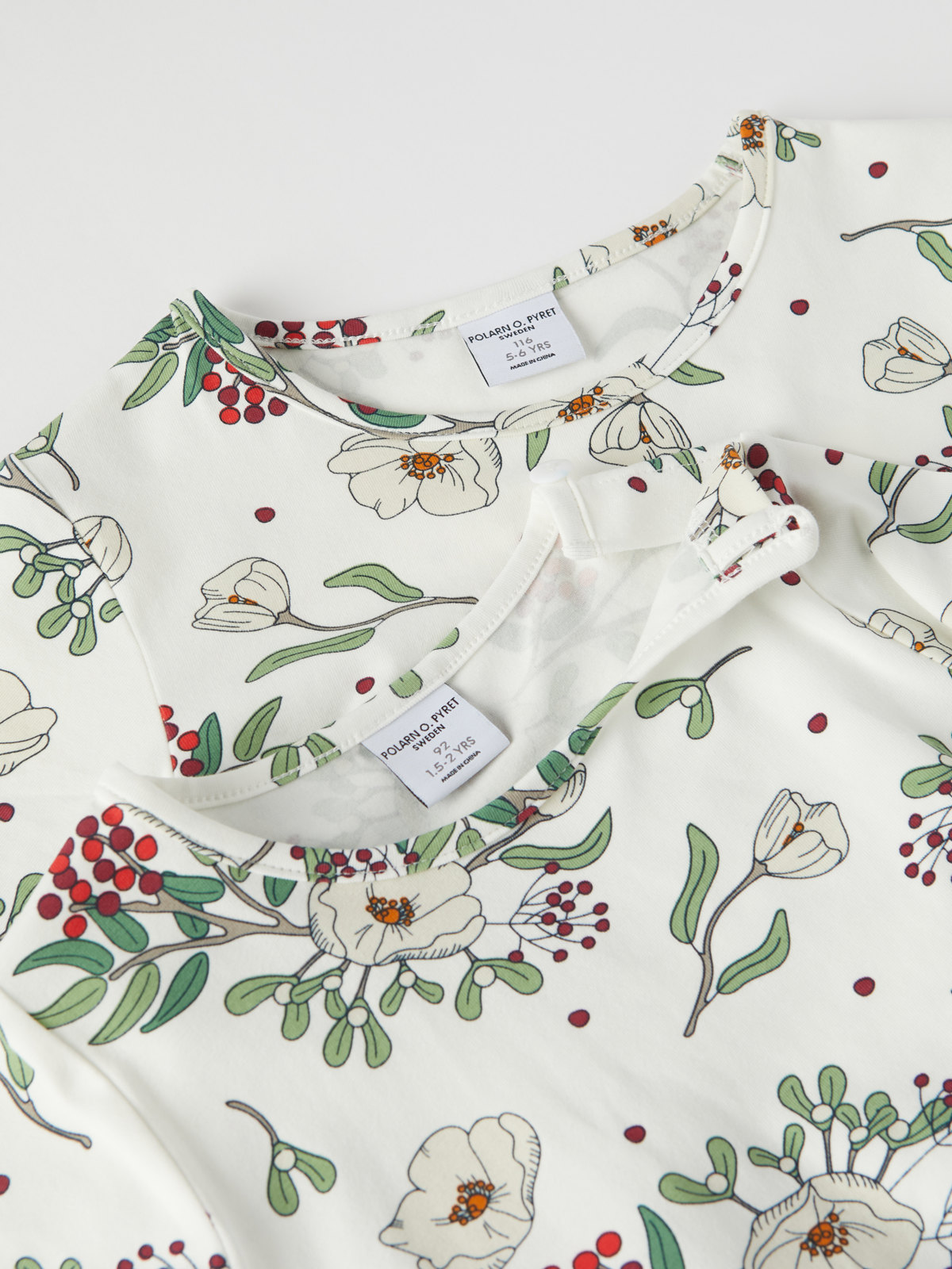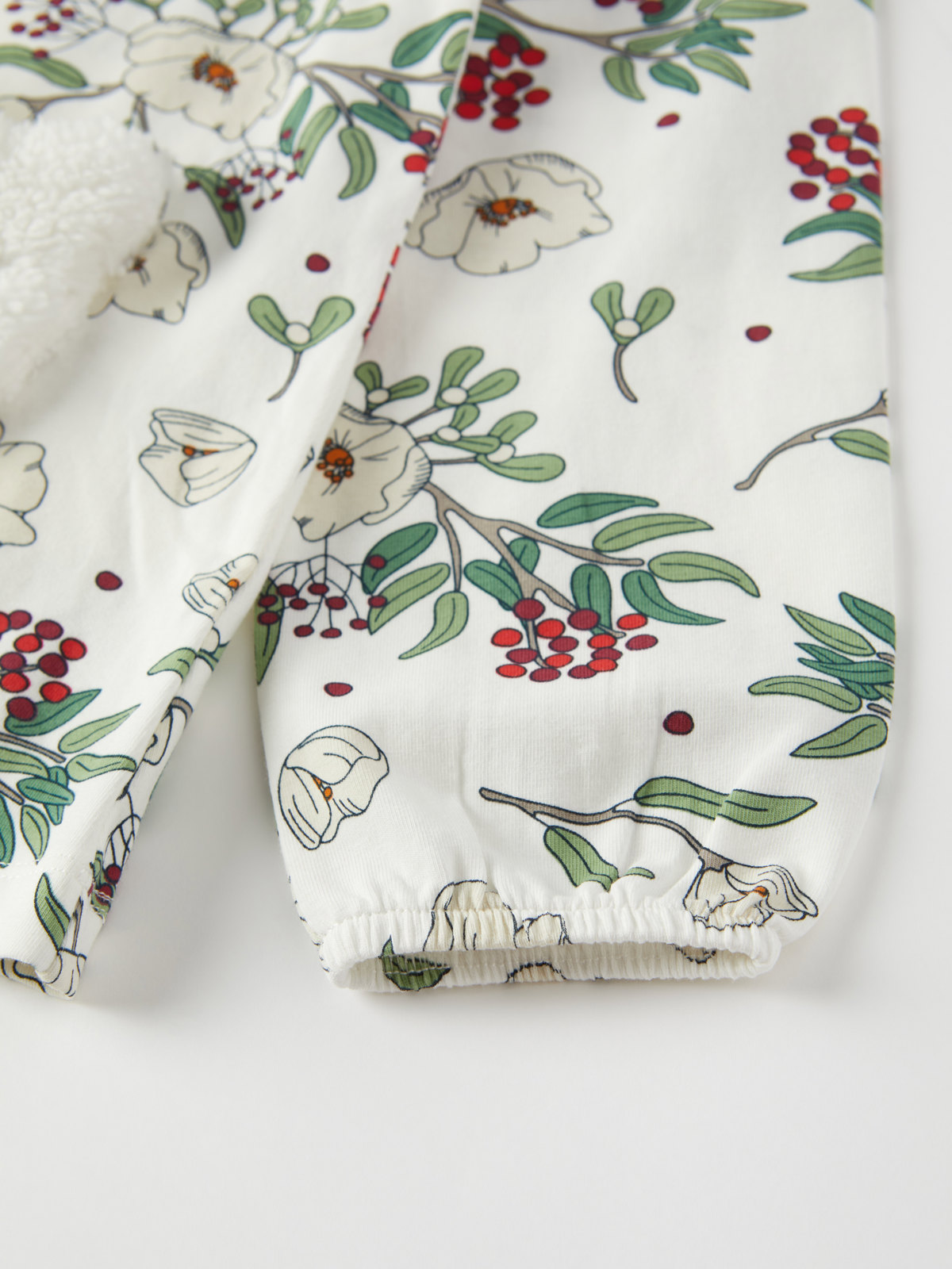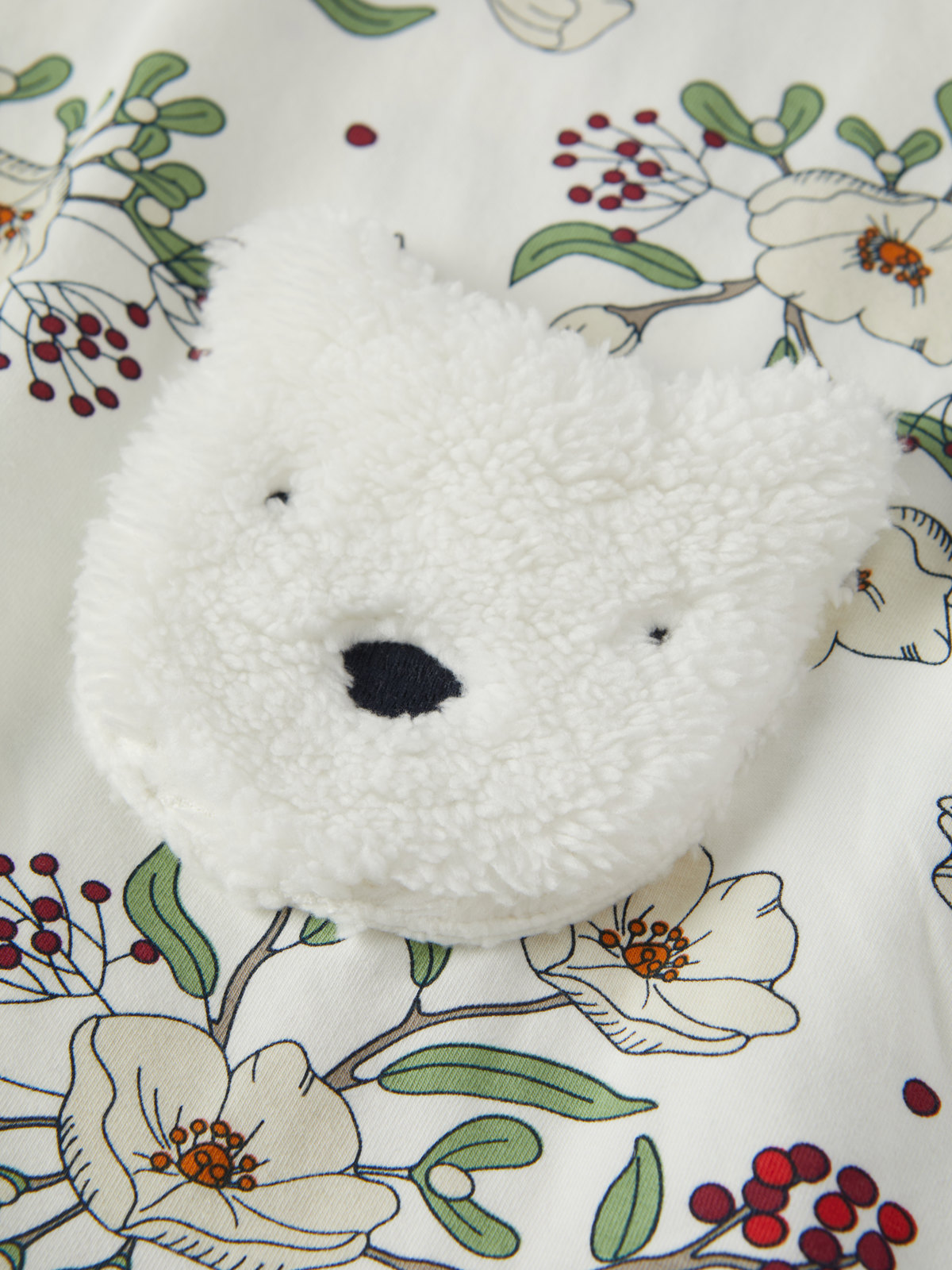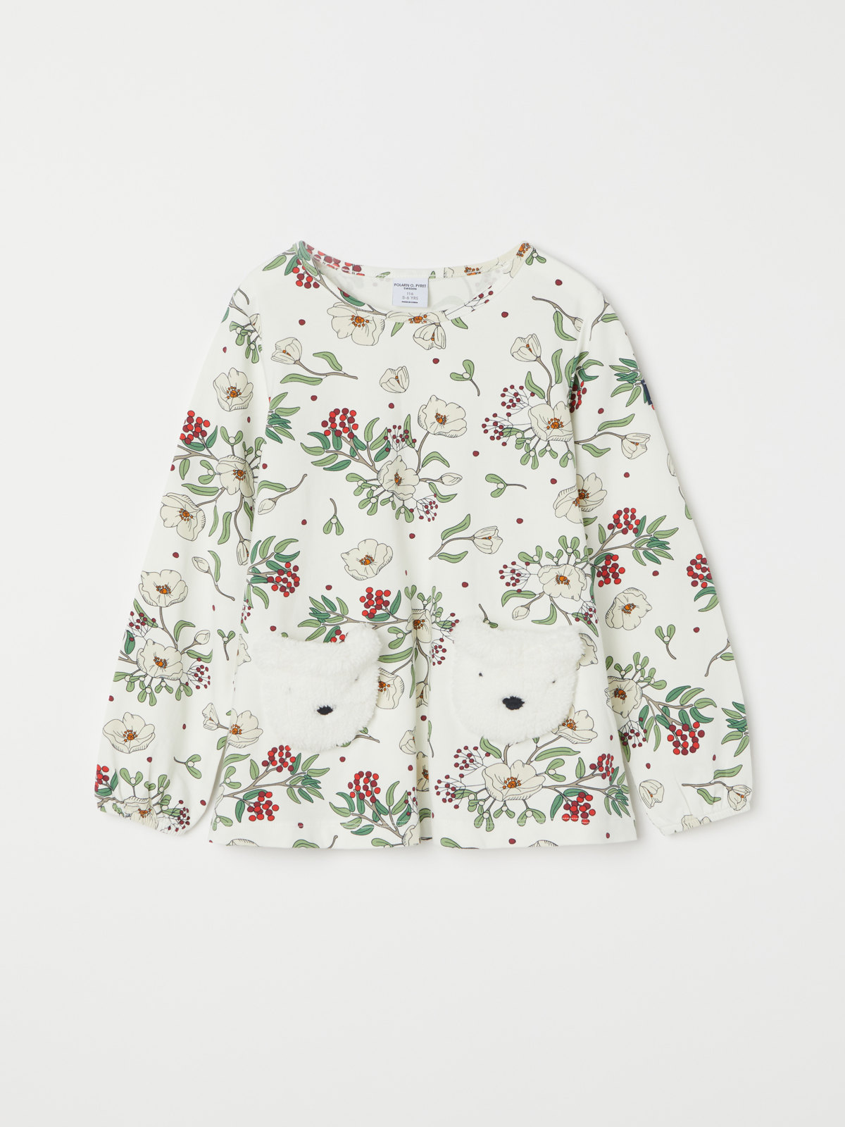 Topp i myk økologisk bomull helmønstret med blomster. Toppen har to festlige lommer formet som bjørner og strikk nederst på ermene.