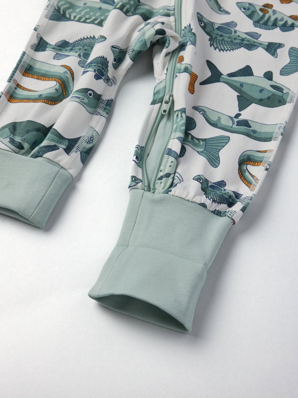 Hel pyjamas i myk økologisk bomull, helmønstret med fisker. Pyjamasen har ekstra myke, flate sømmer som er skånsomme mot følsom hud. Vrangbordene nederst på ermene og bena er ekstra lange og kan brettes ned etter hvert som barnet vokser.