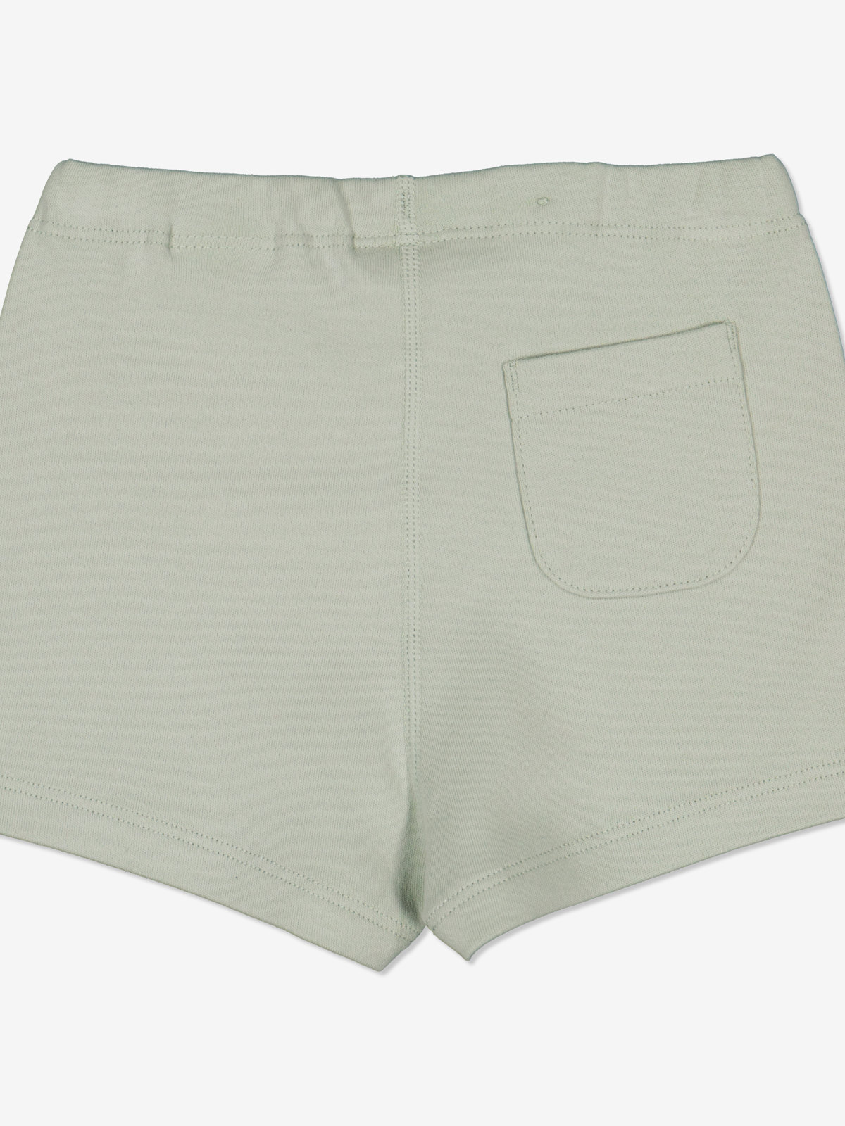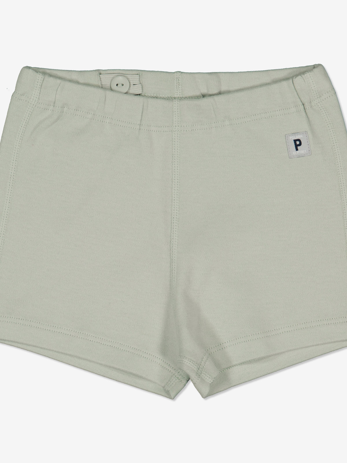 Ensfarget shorts i 100 % økologisk bomullstrikot, til baby. Shortsen er luftig og sydd med ekstra myke sømmer som ligger mykt mot babyens følsomme hud. Elastisk midje som kan reguleres med knapphullsstrikk.