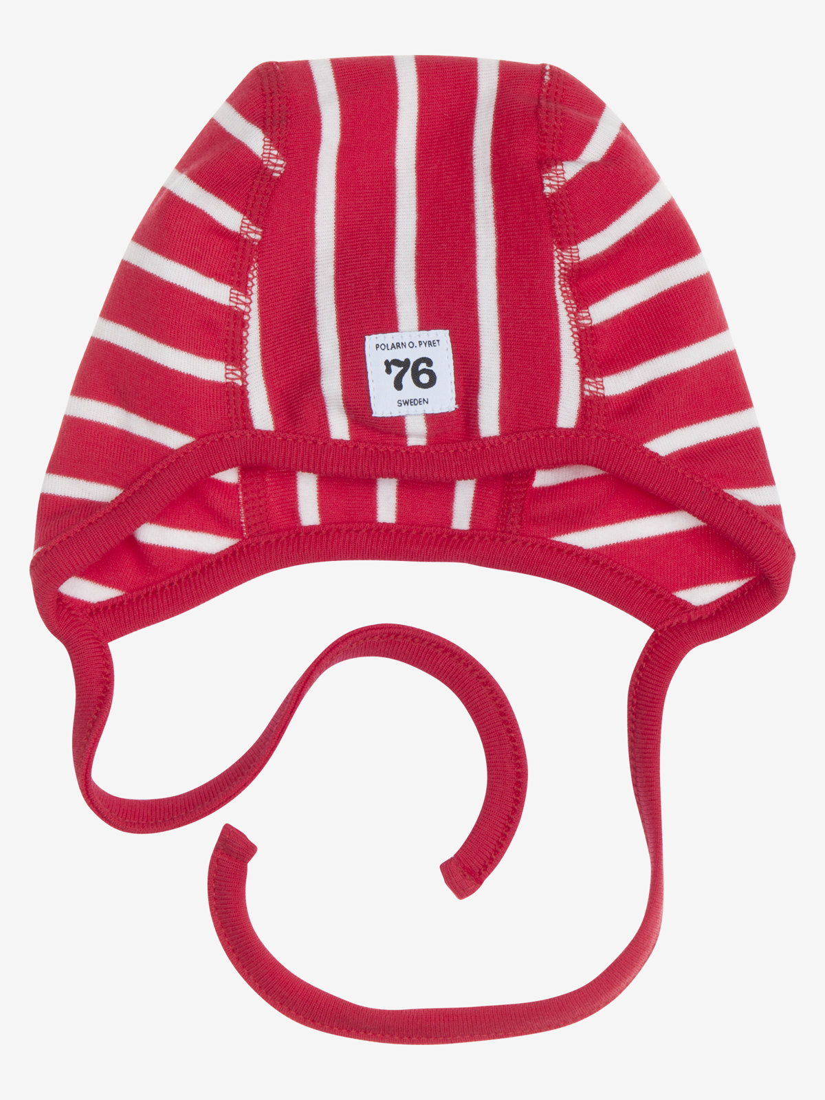 Stripet hjelmlue i 100 % økologisk bomull til nyfødt. Luen har våre klassiske striper og knytebånd under haken som holder luen på plass.