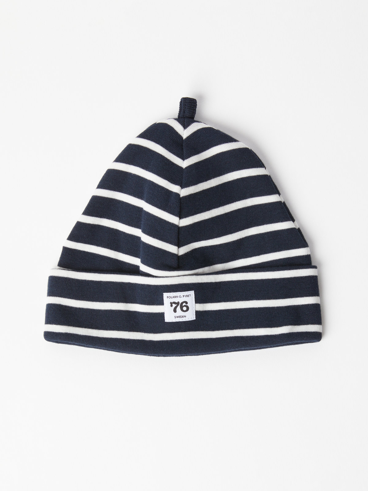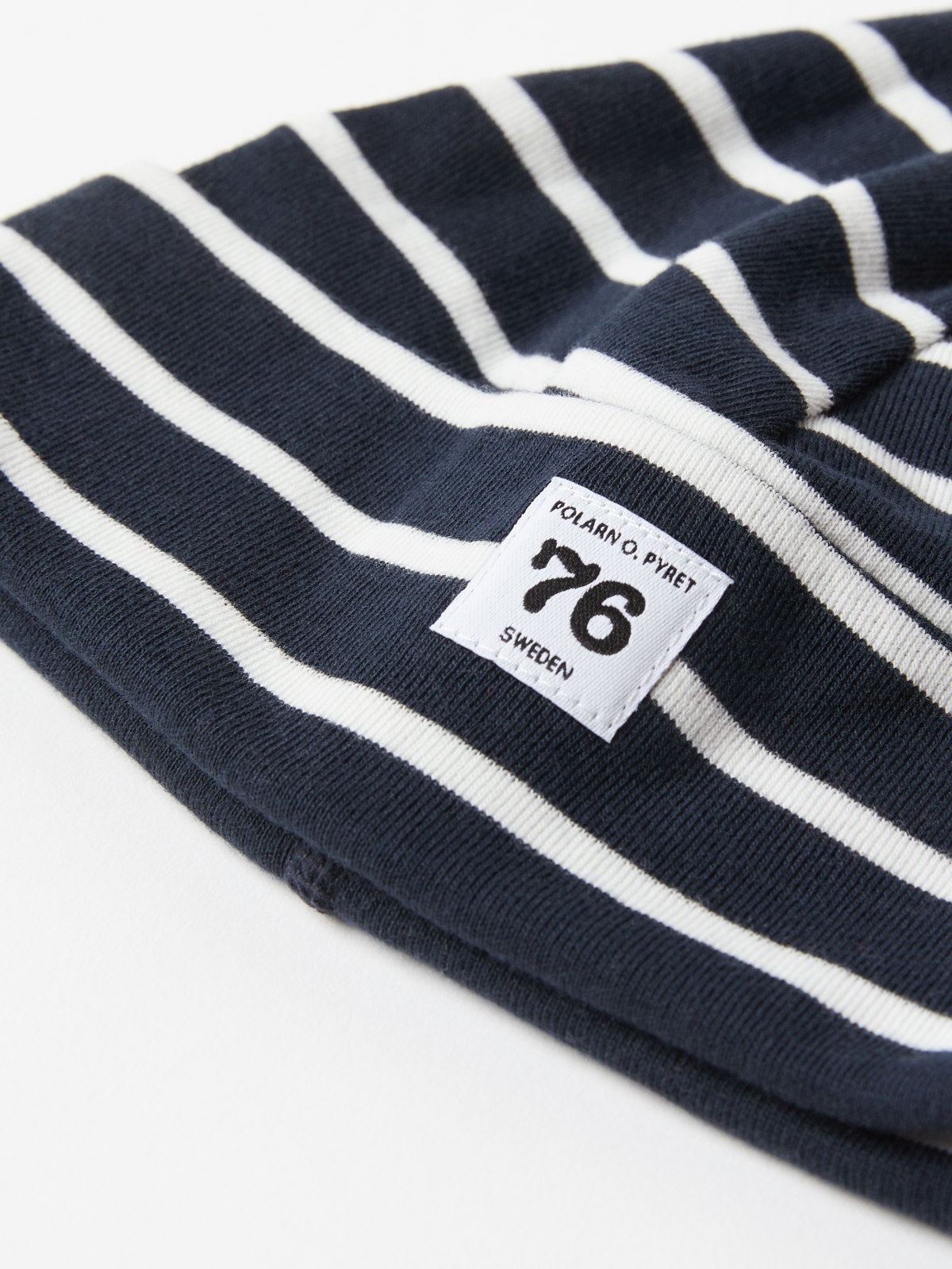 Stripet lue i 100 % økologisk bomull til baby. Luen har våre klassiske striper og en oppbrett som kan justeres etter babyens hodestørrelse.