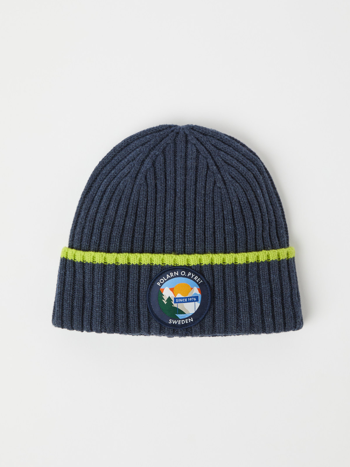 Ribbestrikket lue i varmende ullblanding. Luen har en myk oppbrett med en fin applikasjon foran.