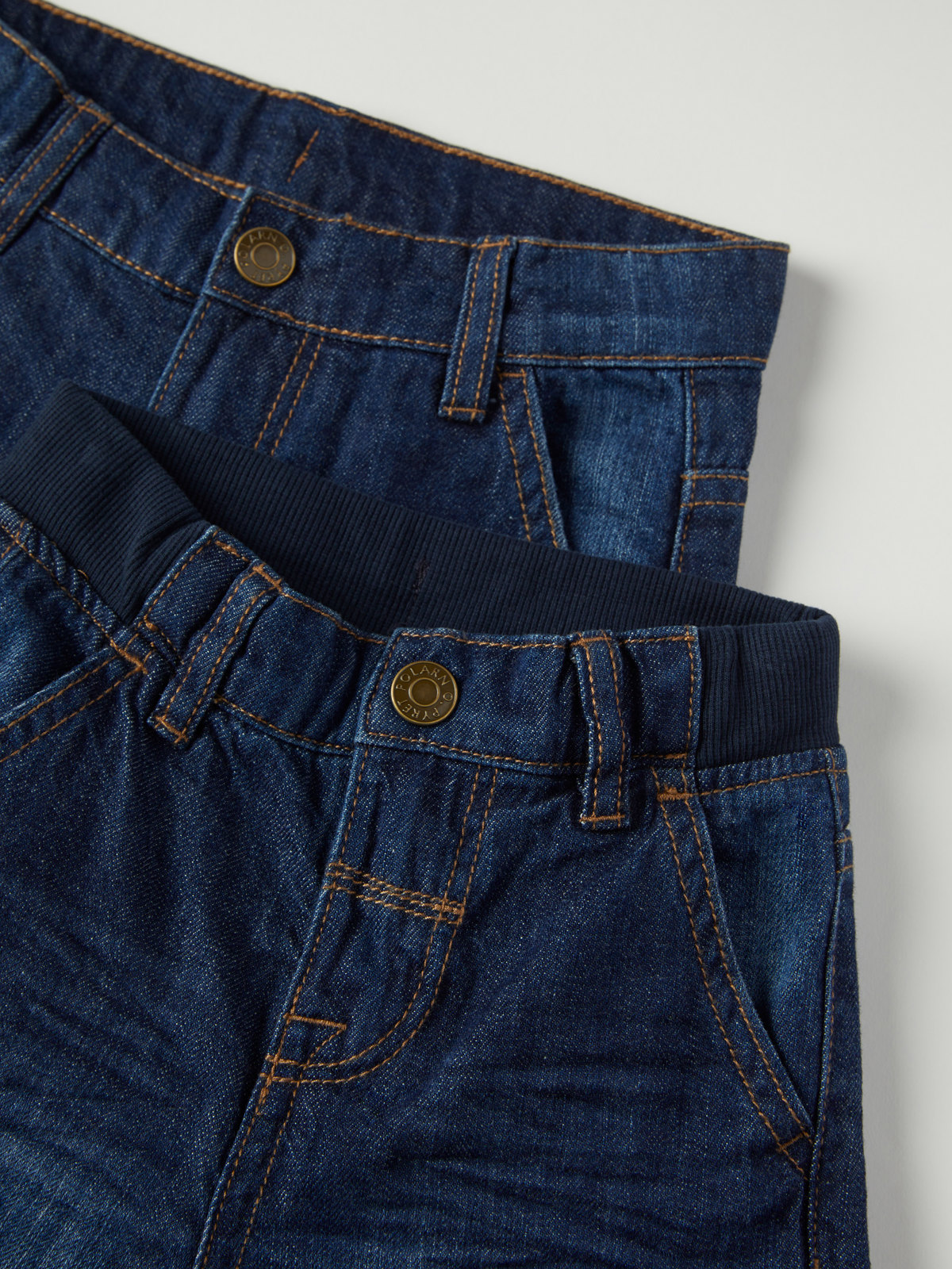 Størrelsene 86-92 har myk ribbestrikket vrangbord i midjen.