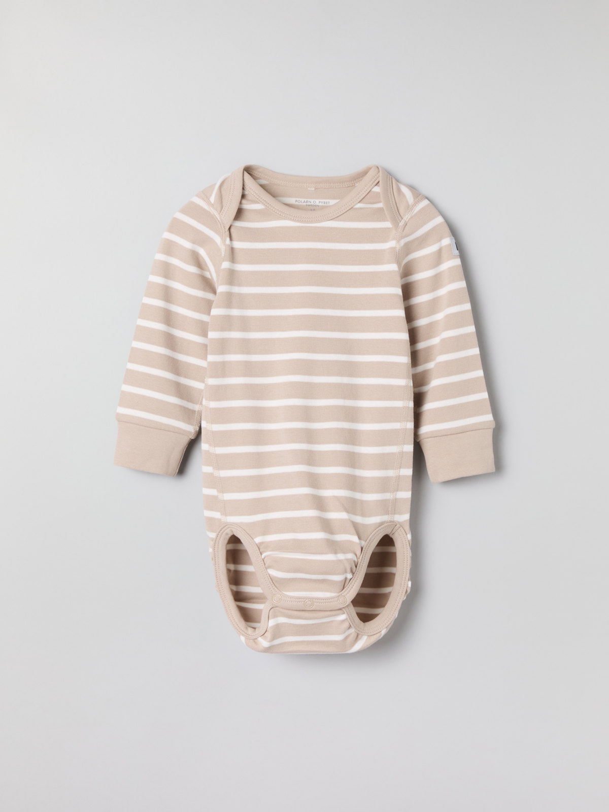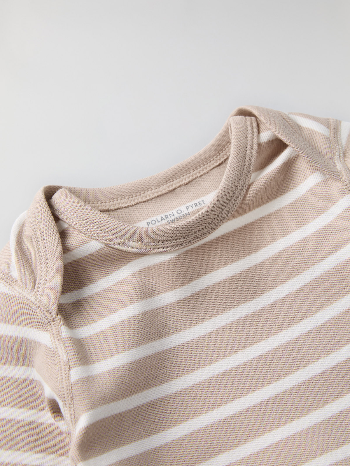 Et perfekt basisplagg å ha i barnegarderoben! Bodyen har våre klassiske striper og omslagseffekt på skuldrene, samt myk ribbestrikket vrangbord nederst på ermene. Trykknappene i skrittet gir enklere kles- og bleieskift.