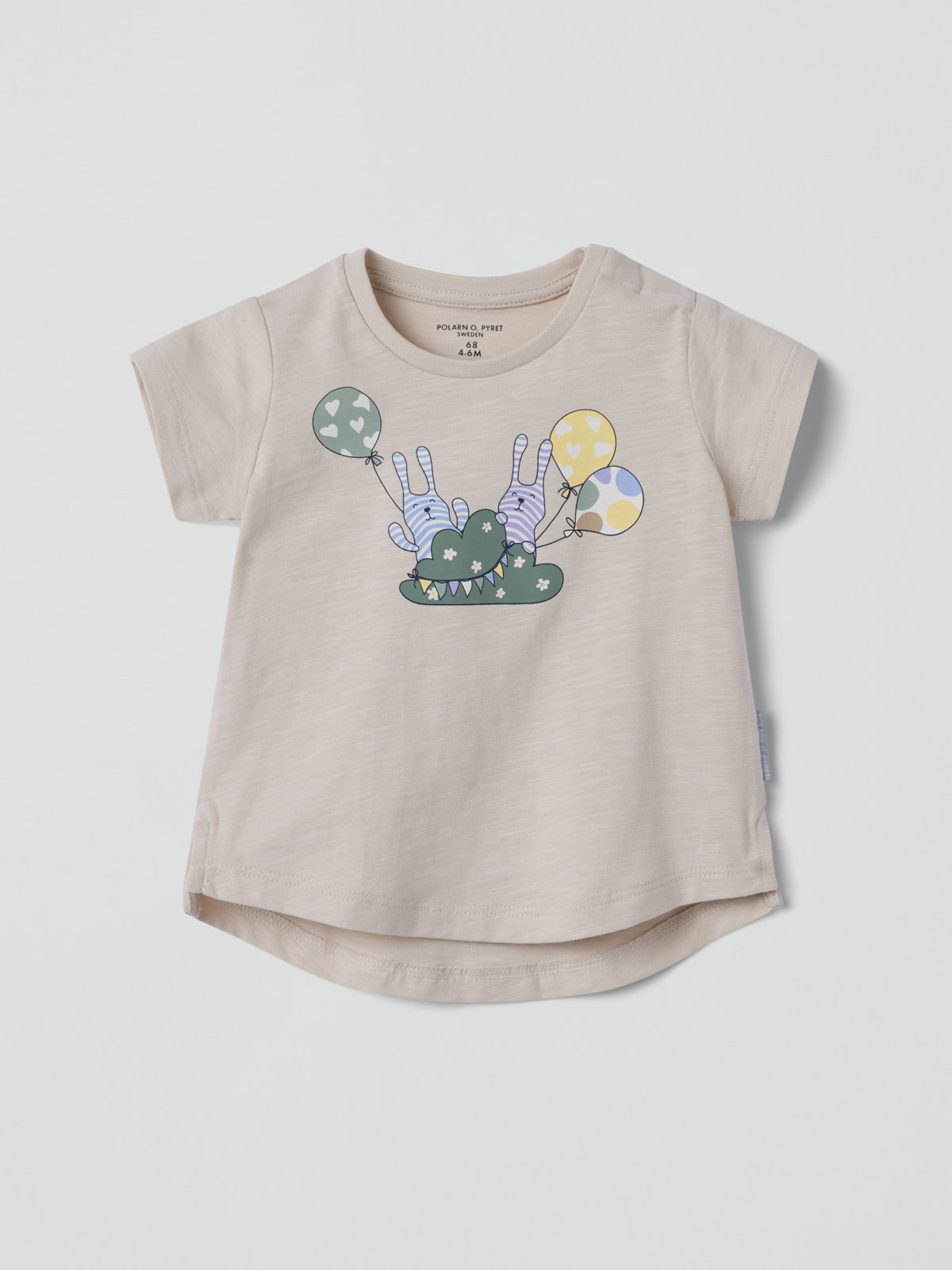 Kortermet genser i mykt og behagelig slubmateriale i 100 % økologisk bomull med rund nederkant. Genseren har vid passform og et søtt trykk med kaniner på forsiden.