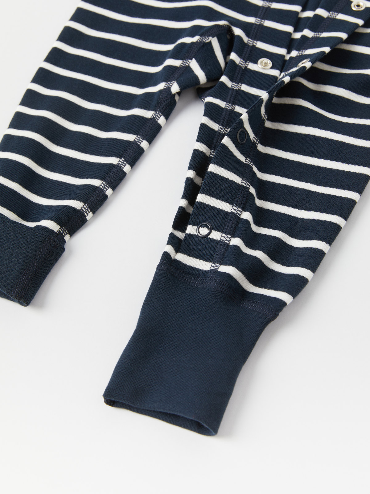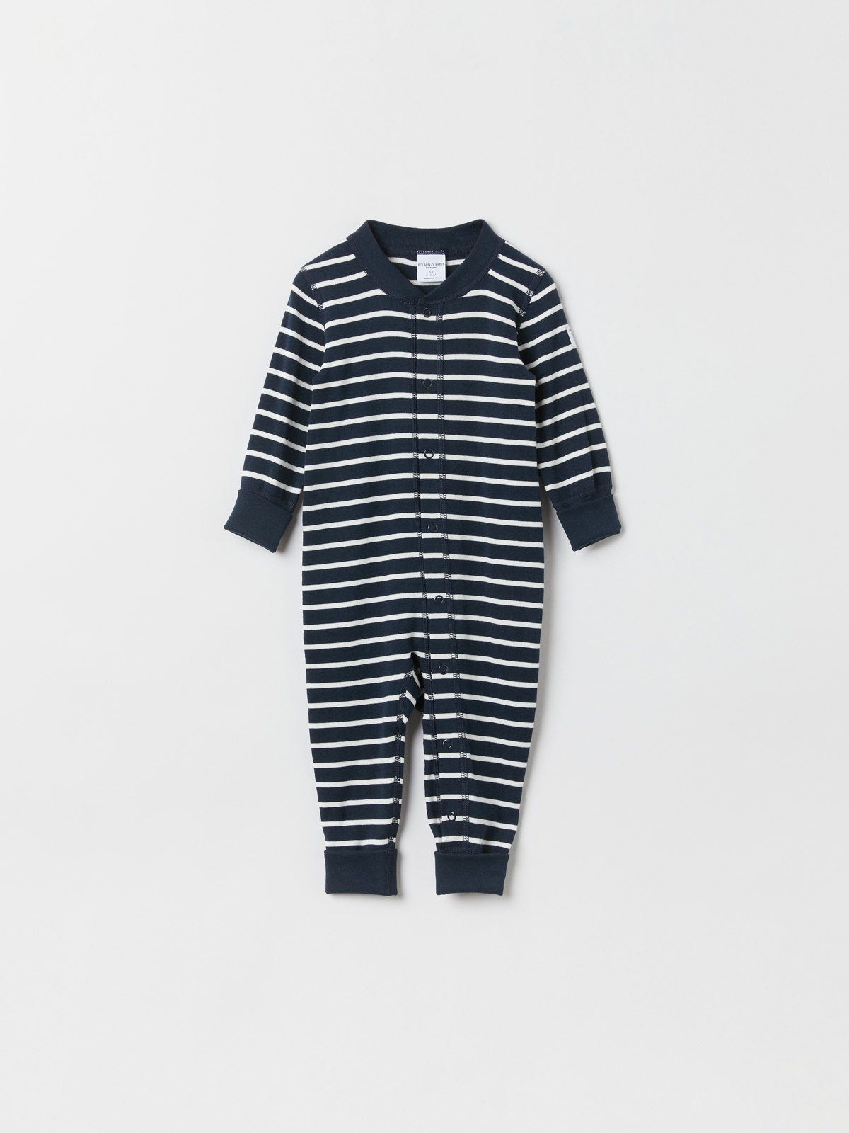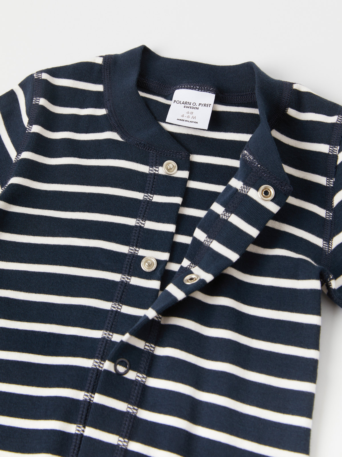 Stripet dress i 100 % økologisk bomull til de aller minste. Dressen har våre klassiske striper og trykknapper fra hals til nederst på bena som gjør den lett å ta på og av. Vrangbordene er ekstra lange og kan brettes ned etter hvert som barnet vokser.