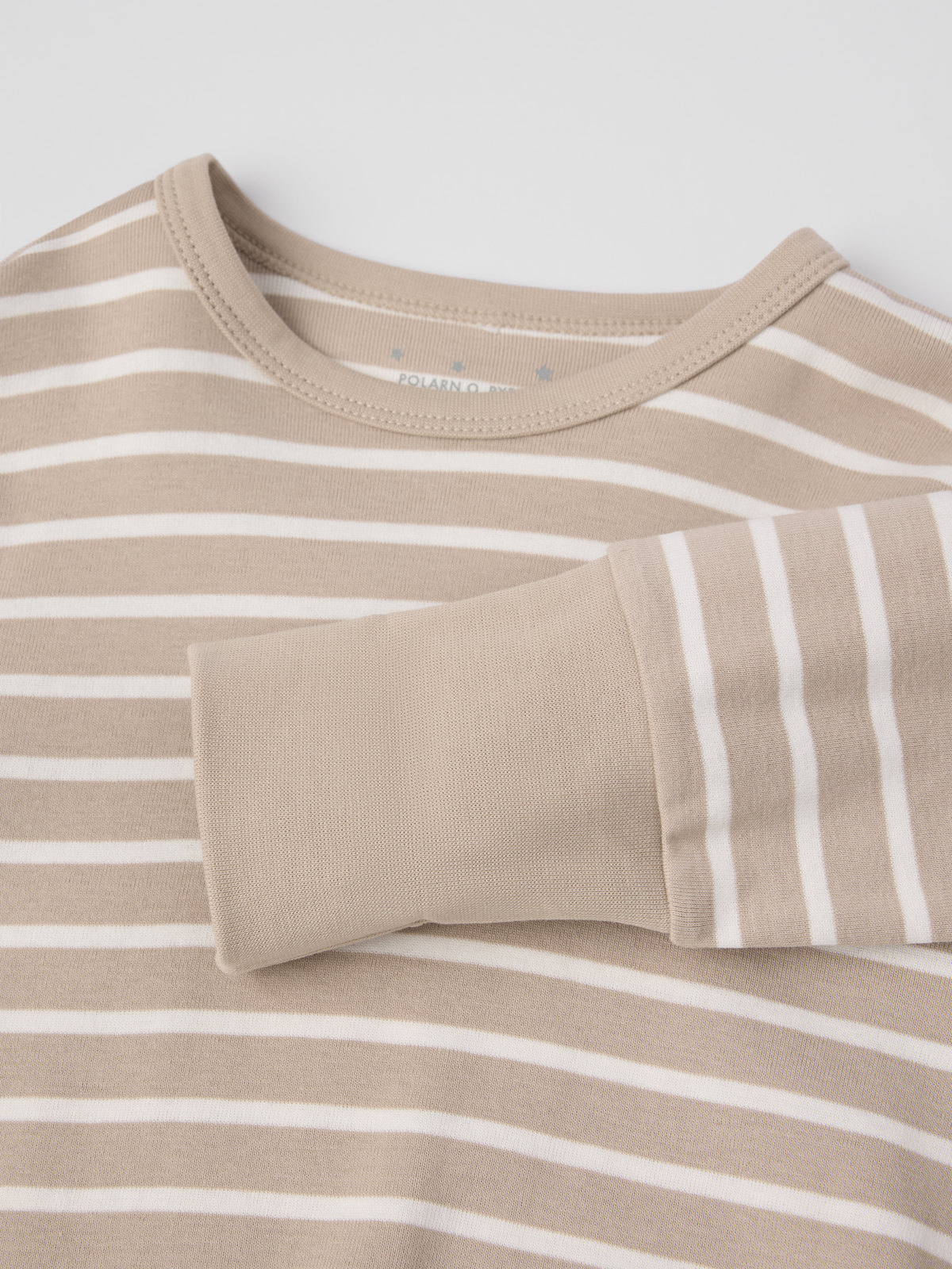 Todelt pyjamas i myk økologisk bomull med våre klassiske striper. Overdelen har ekstra lang vrangbord nederst på ermene, som kan brettes opp eller ned. Buksen har elastisk midje og ekstra lang vrangbord nederst på bena.