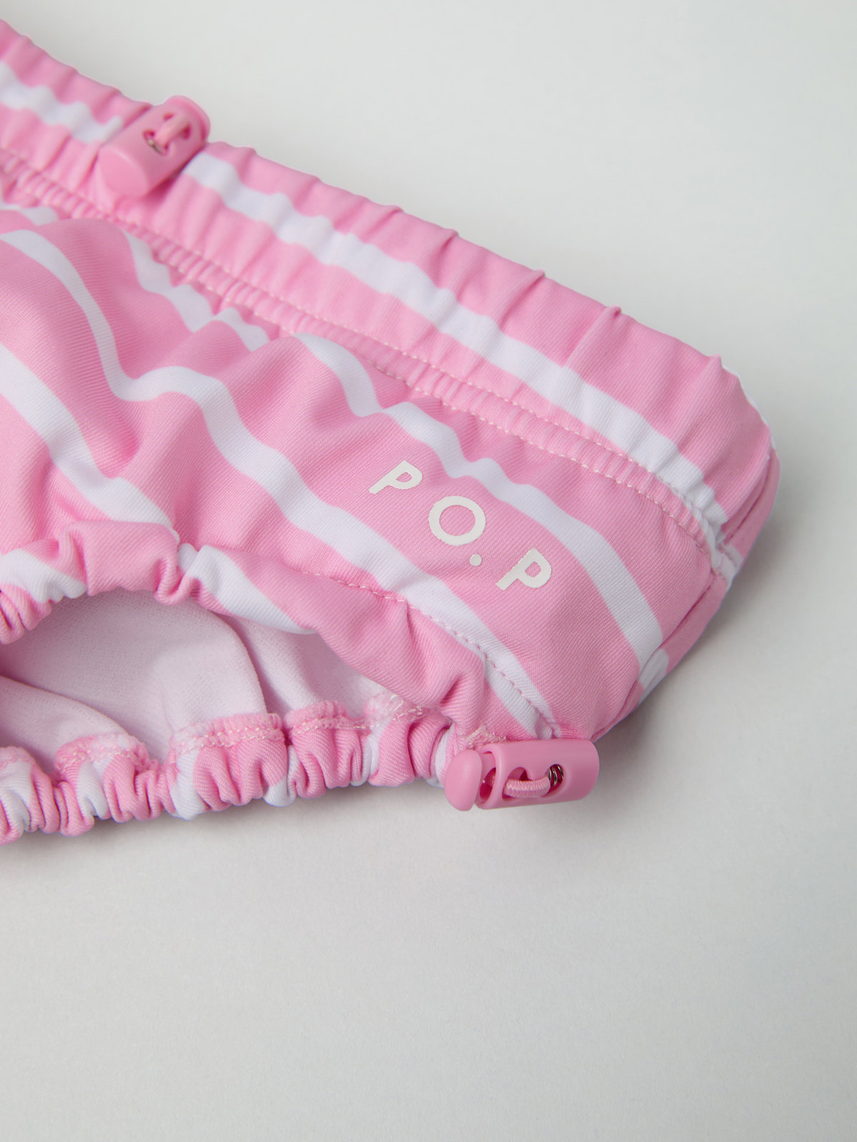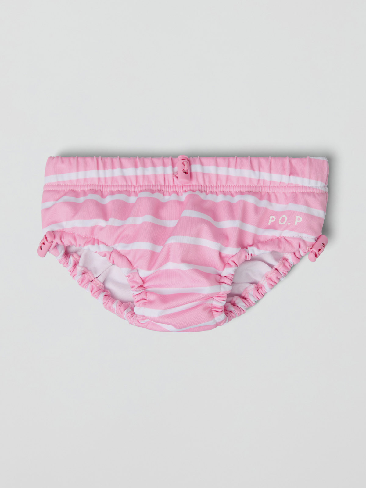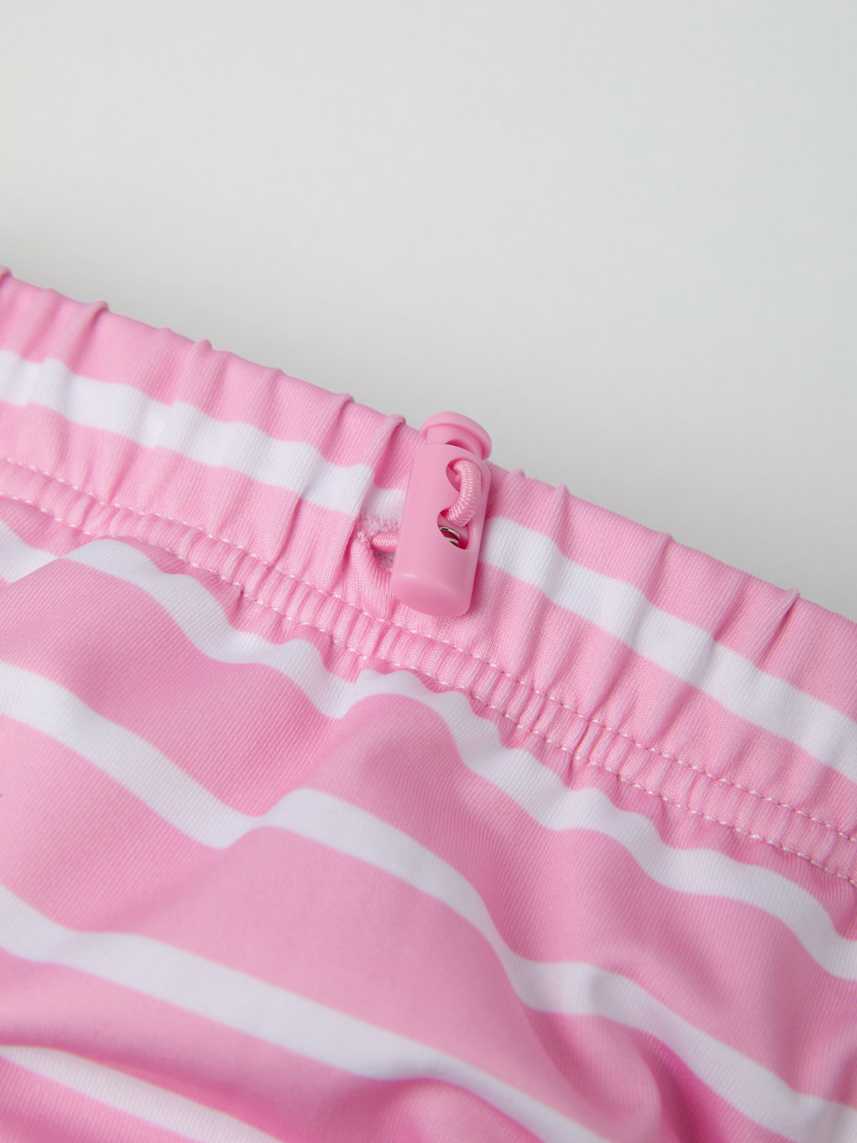 Stripet badebleie i resirkulert materiale – perfekt til babysvømming eller badeturen! Badebleien har et ekstra fôr som fanger opp små uhell, og rundt benåpningene har den justerbar strikk. Midjen er elastisk og kan reguleres på innsiden med knytebånd.
