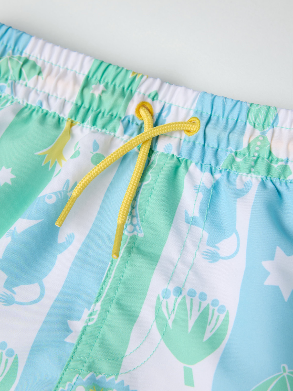 Badeshortsen er helmønstret med illustrasjoner fra Tove Janssons fortellinger om Mummitrollet.