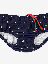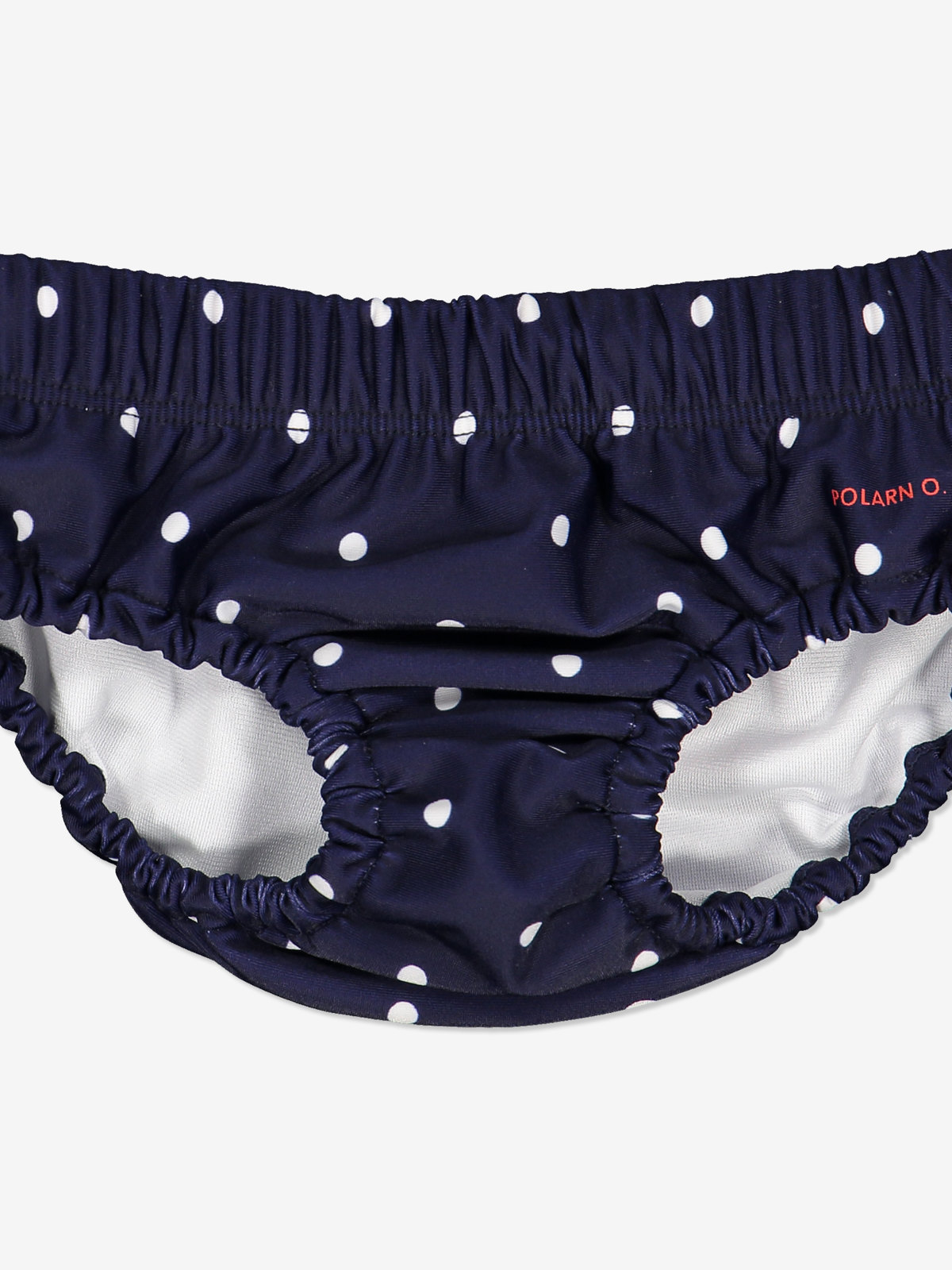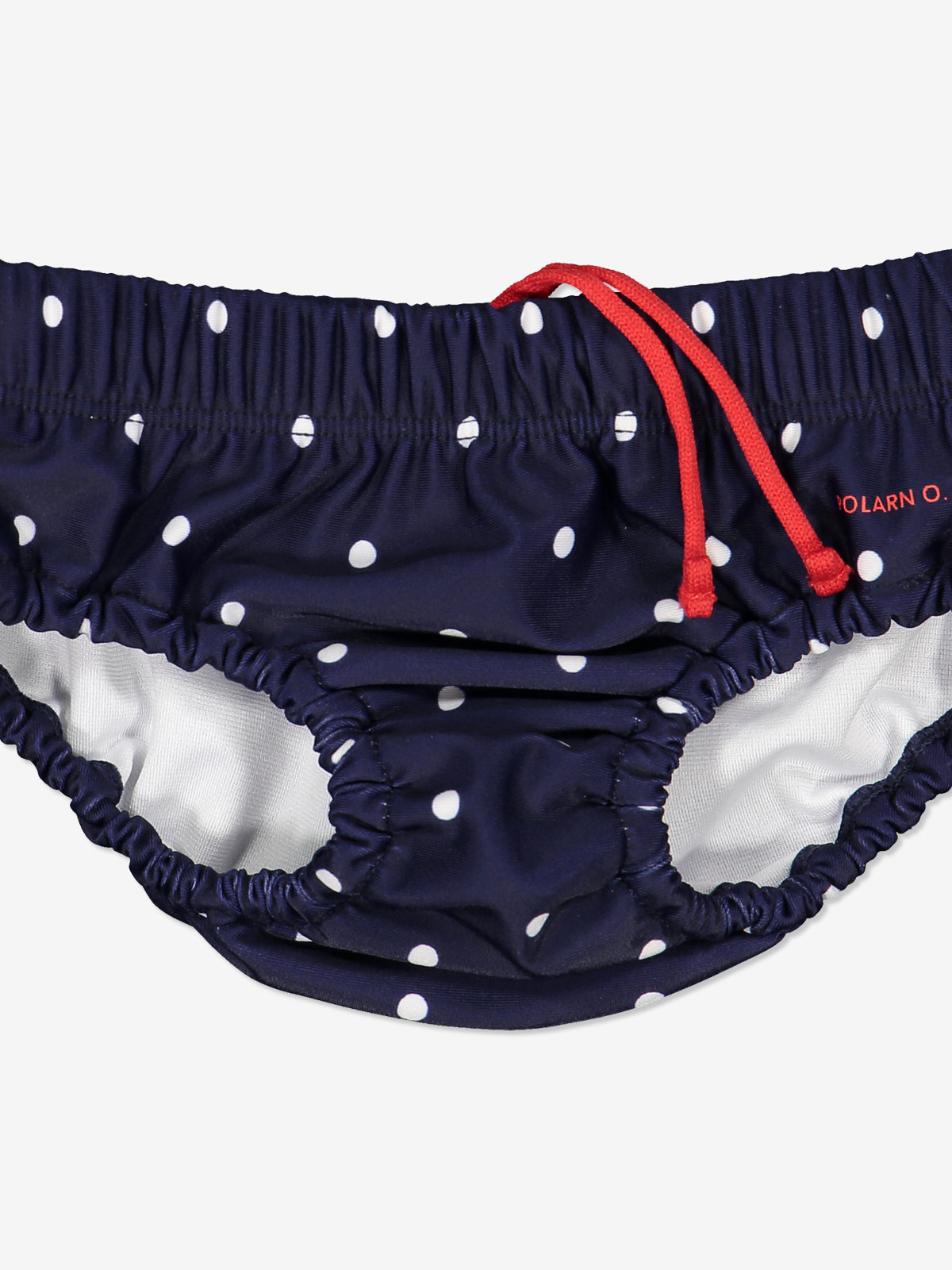 Prikket badebukse i resirkulert stoff med UV-beskyttelse til baby. UPF 50 (Ultraviolet Protection Factor) gir 98 prosent beskyttelse mot de skadelige UV-strålene. Badebuksen egner seg perfekt for babysvømming, da den har et ekstra fôr som fanger opp mindre uhell. Justerbar strikk rundt benåpningene og elastisk midje som kan reguleres fra innsiden med knytebånd. Baksiden har et undervannstrykk.