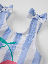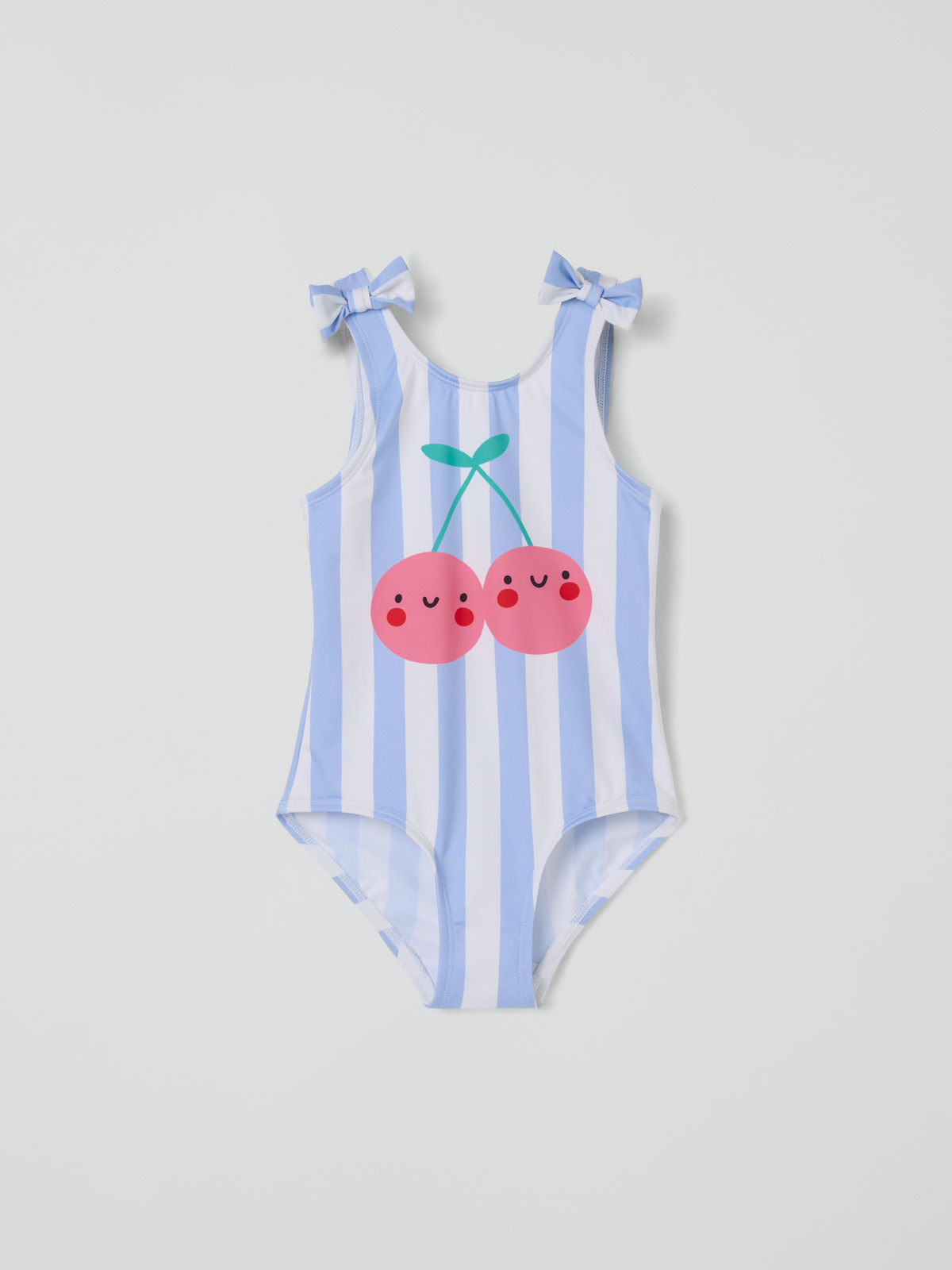 Stripete badedrakt i mykt og behagelig materiale av resirkulert polyester. Badedrakten har et stort kirsebærmotiv foran og dekorative knuter på skulderstroppene. Den er helfôret og sydd med ekstra myke sømmer som ikke gnager.