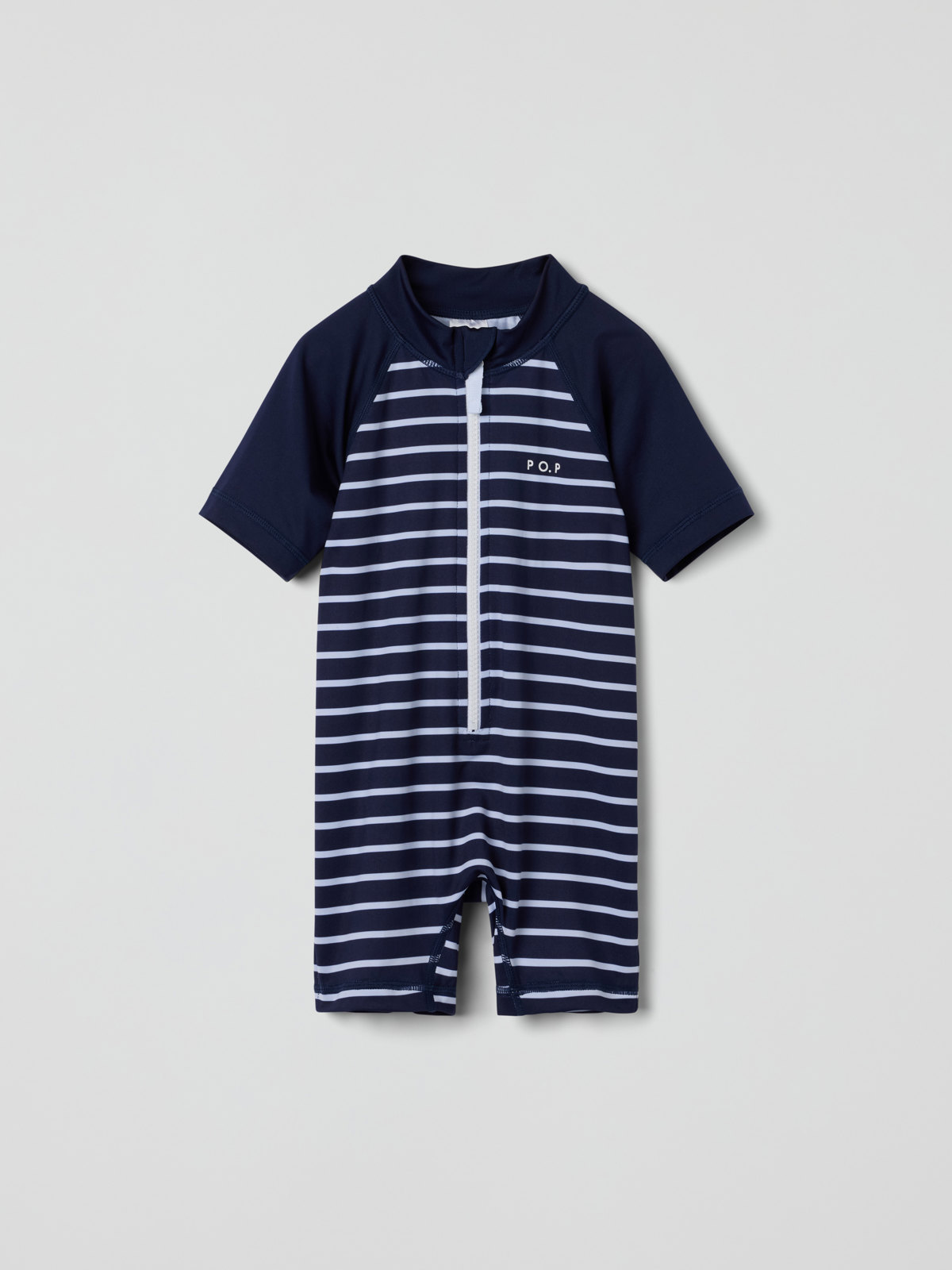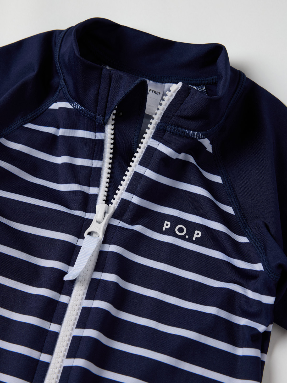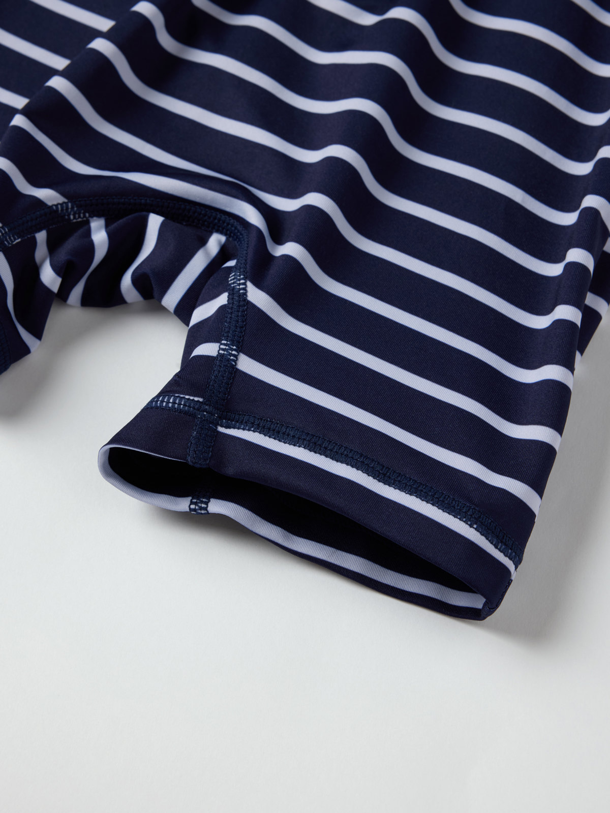 Vår klassiske stripete UV-dress med UPF 50, fremstilt i et mykt og behagelig materiale av resirkulert polyester og med ekstra myke sømmer som ikke gnager. Glidelåsen foran gjør den enkel å ta på og av, og har en beskyttelse øverst som hindrer at den gnager mot hake og kinn.