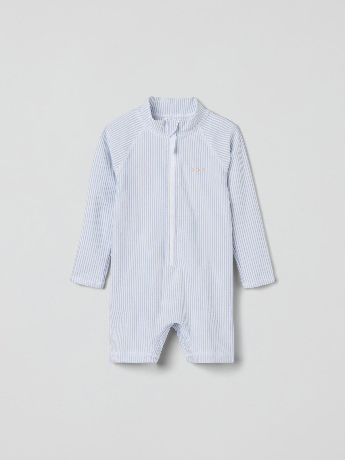 Stripet, langermet UV-dress med UPF 50, fremstilt i mykt og behagelig materiale av resirkulert polyester og med ekstra myke sømmer som ikke gnager. Glidelåsen foran gjør den enkel å ta på og av, og har en beskyttelse øverst som hindrer at den gnager mot hake og kinn.