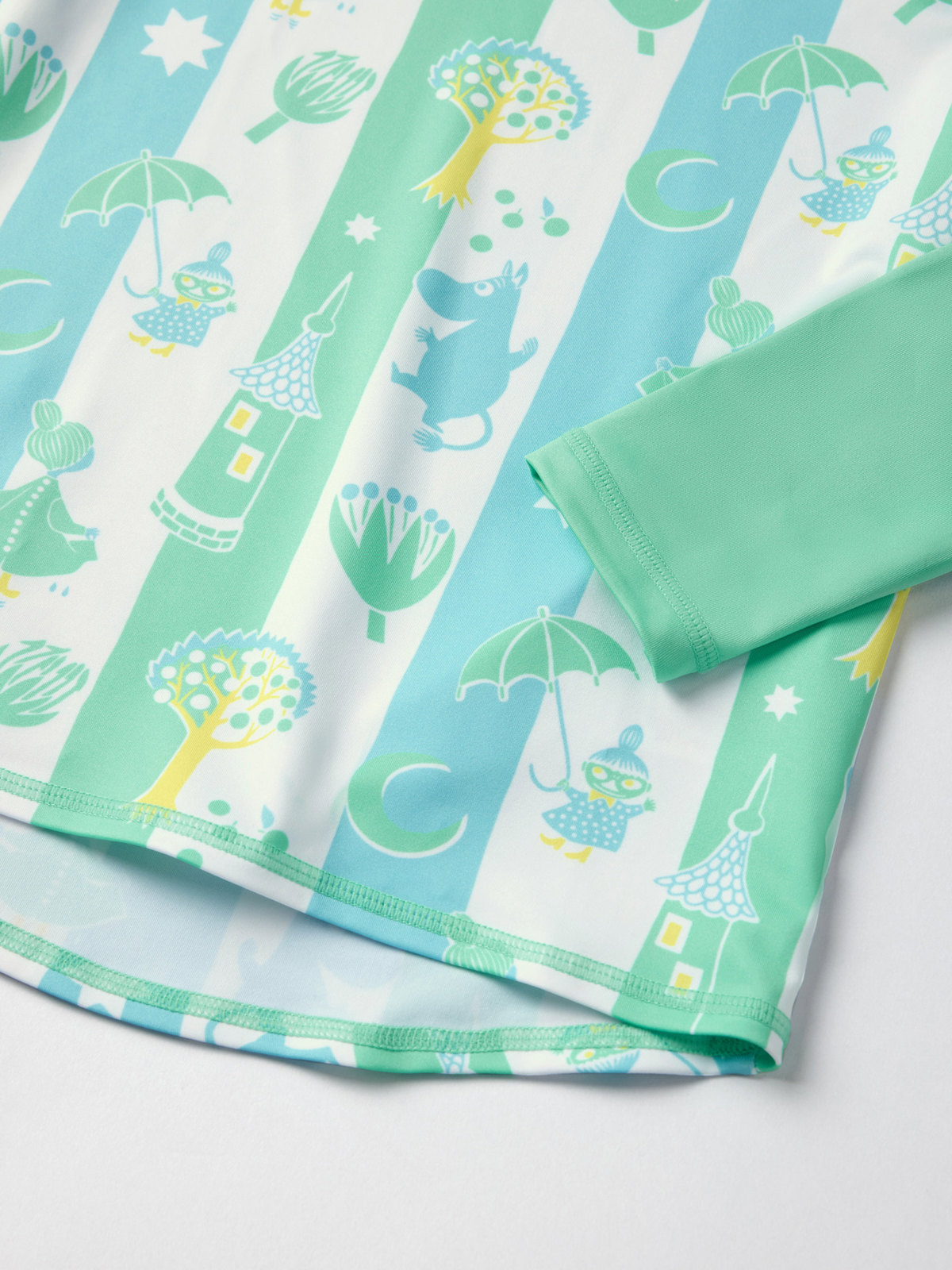 Trøyen er mønstret med illustrasjoner fra Tove Janssons fortellinger om Mummitrollet og har ekstra myke sømmer som ikke gnager. Kan matches med tilhørende UV-bukse!