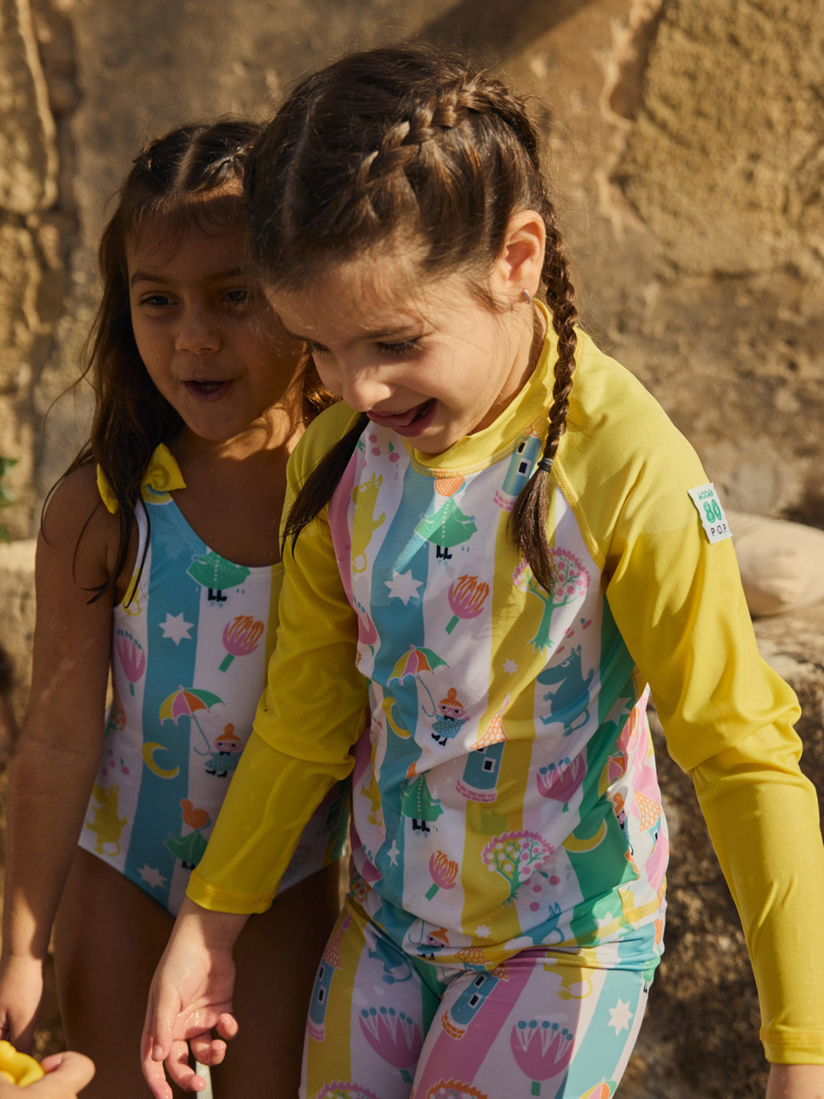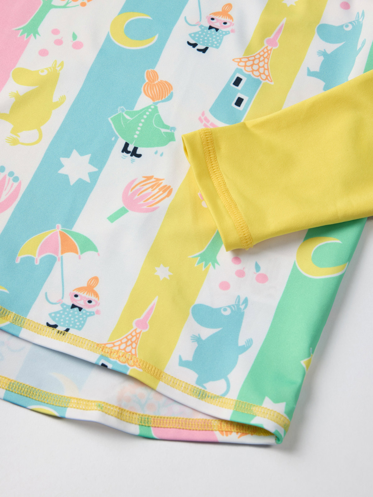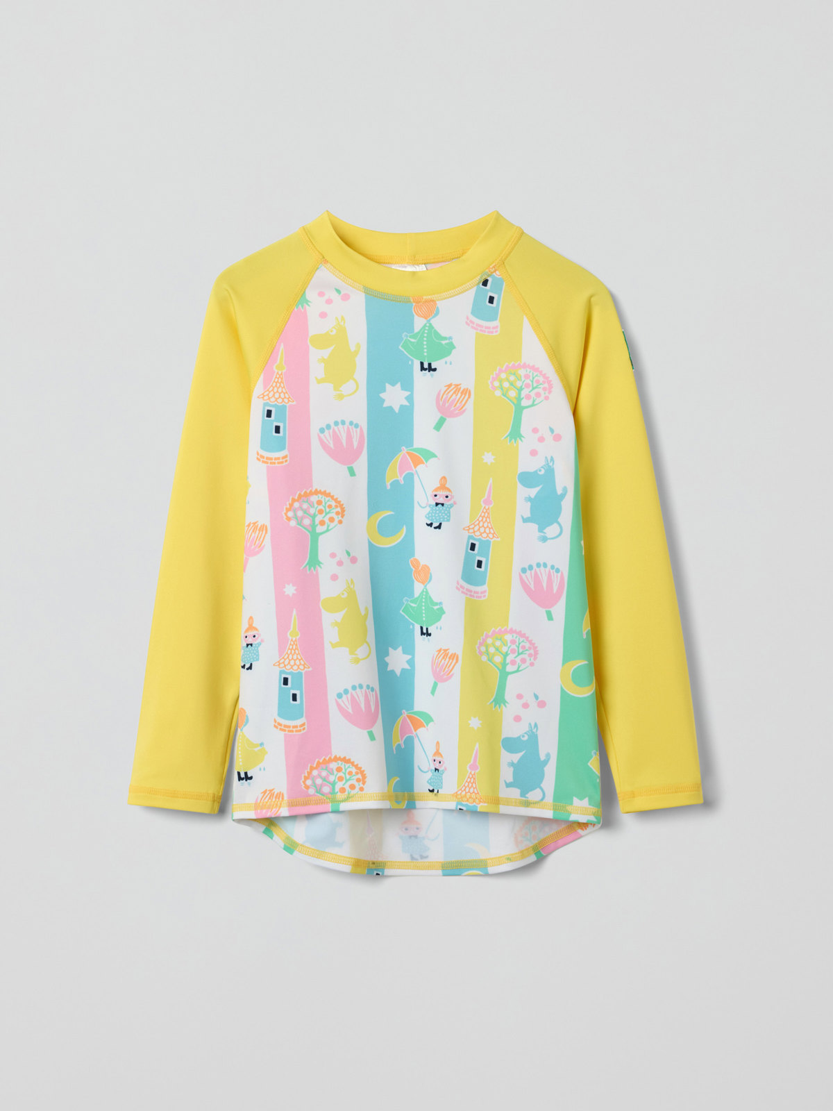 Trøyen er mønstret med illustrasjoner fra Tove Janssons fortellinger om Mummitrollet og har ekstra myke sømmer som ikke gnager. Kan matches med tilhørende UV-bukse!