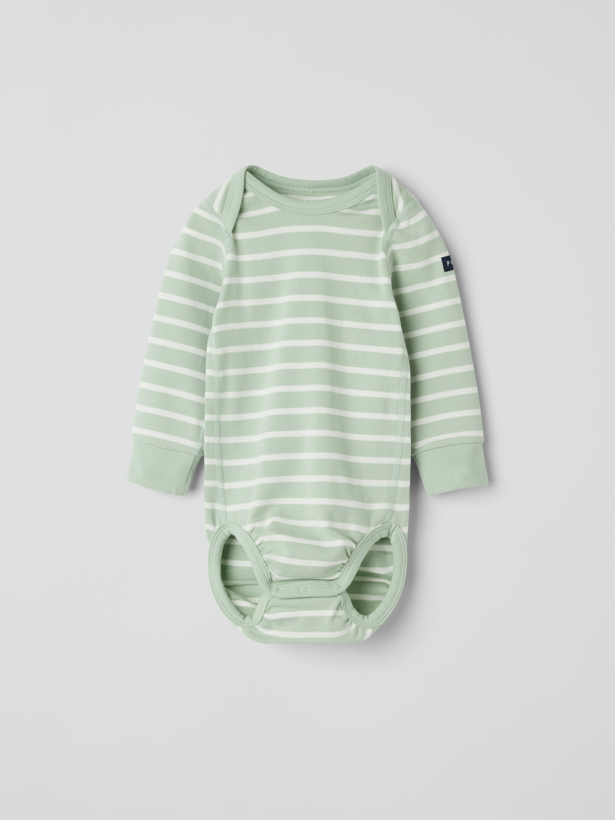 Vår klassiske stripete body i 100 % myk økologisk bomull – et elsket basisplagg som hører hjemme i alle babyers første garderobe! Bodien har omlottlagte skuldre, som gjør den enkel å ta på over hodet. Den har også myke mansjetter på ermene.