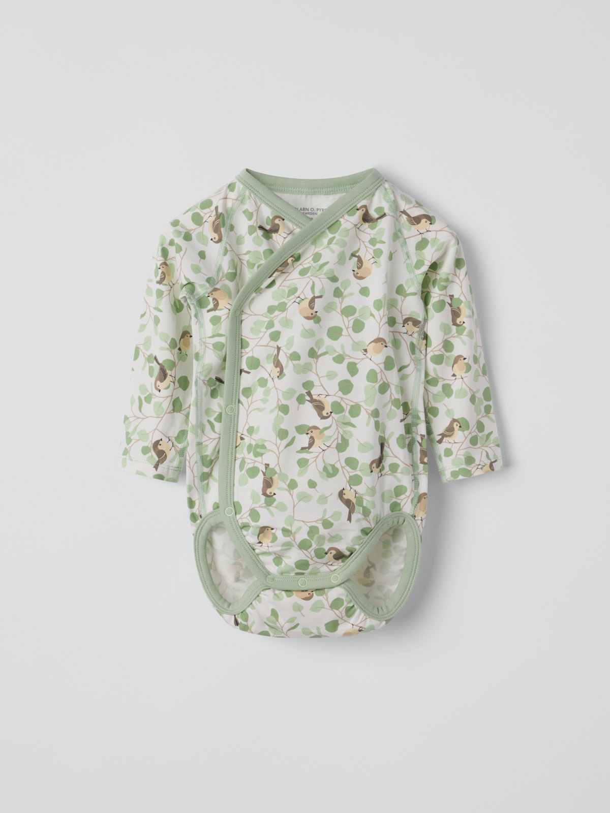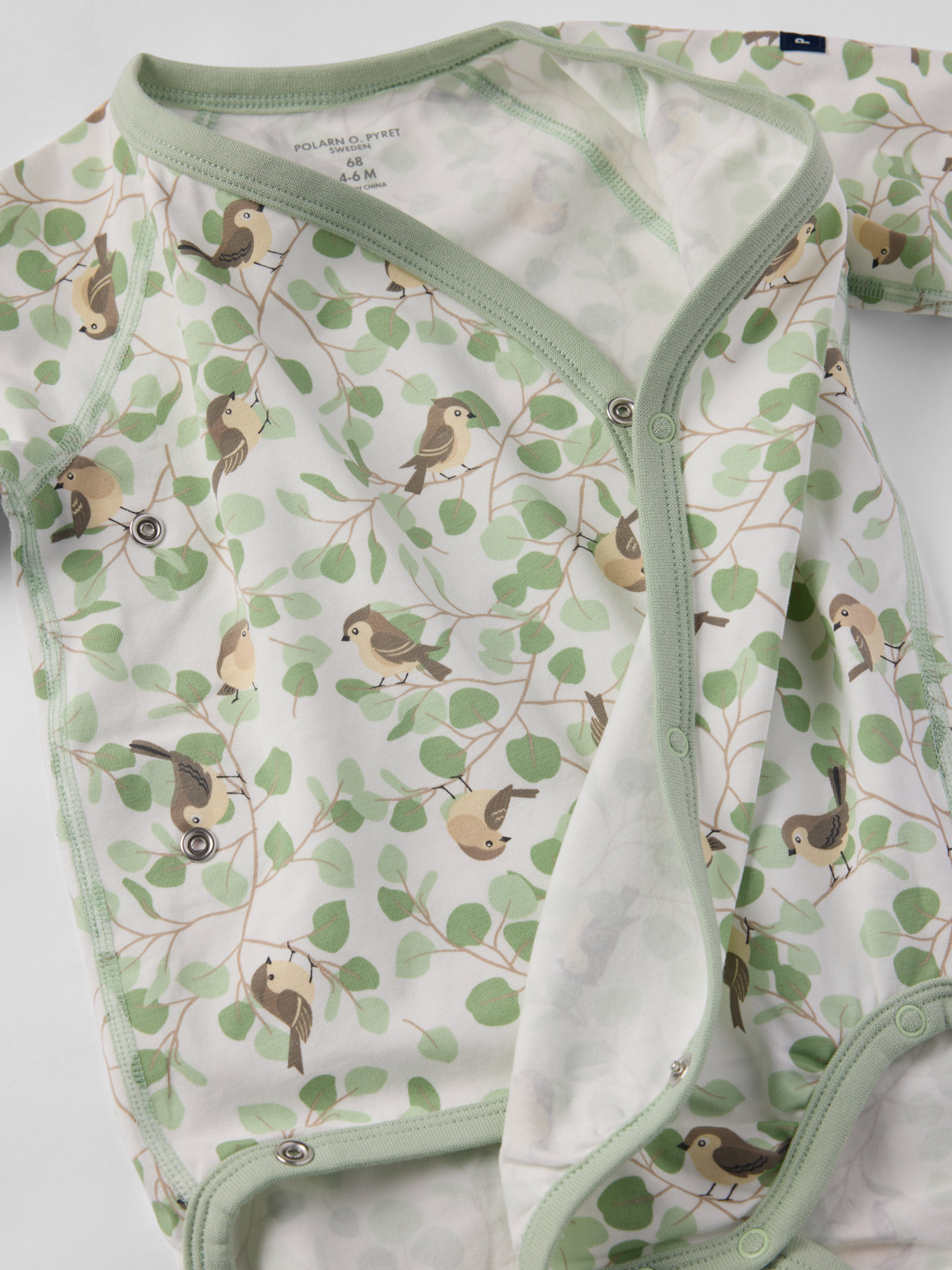 Omslagsbody til baby i økologisk bomull. Bodyen er sydd med ekstra myke sømmer som ikke irriterer sensitiv hud. Trykknappene langs omslagsåpningen gir enklere klesskift.