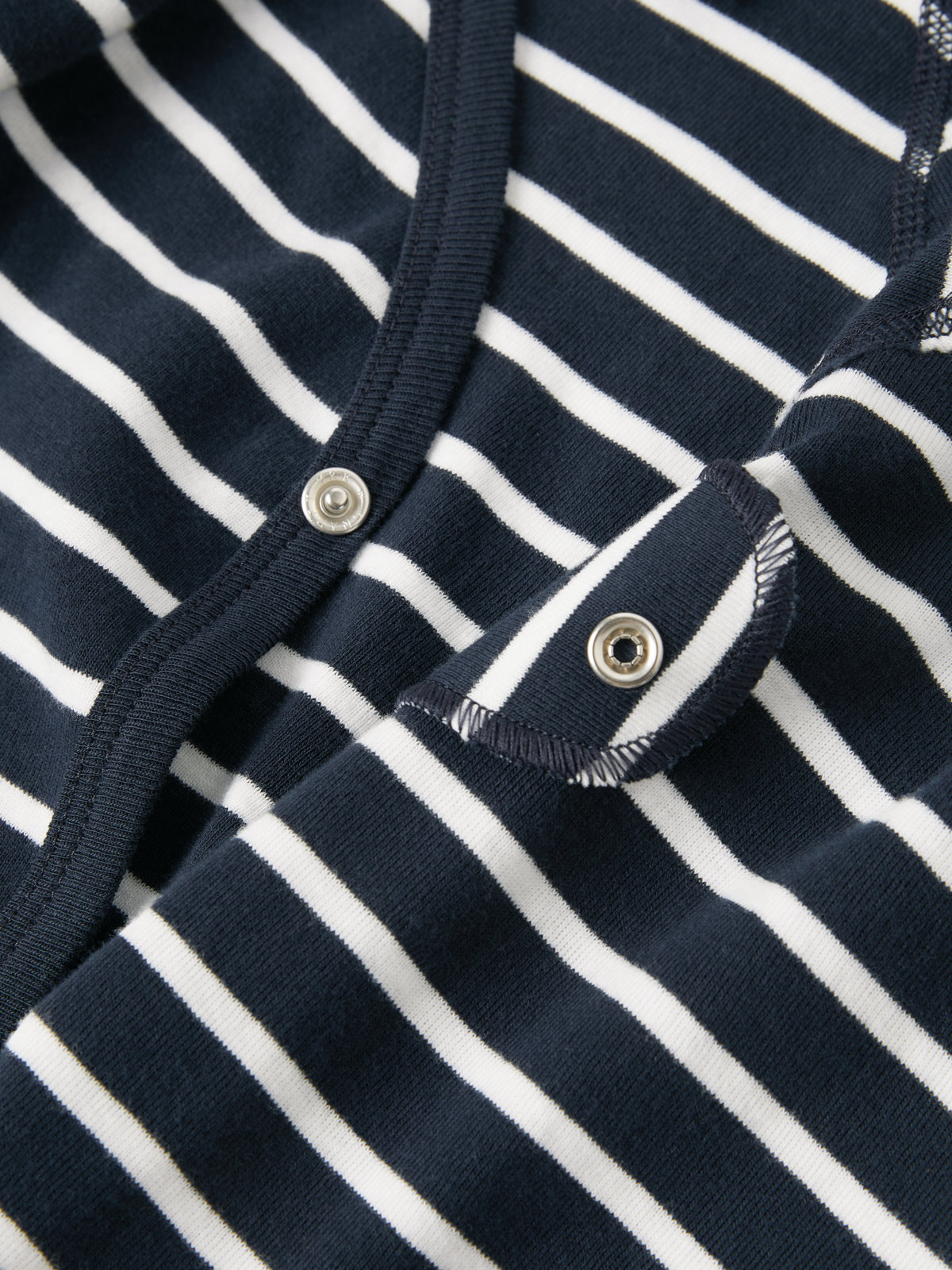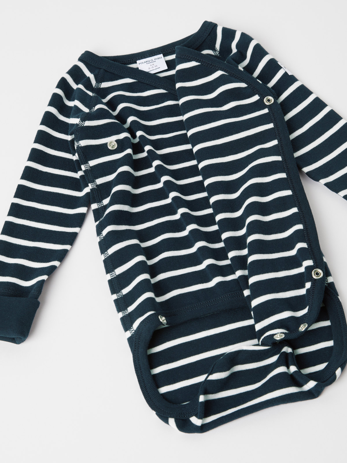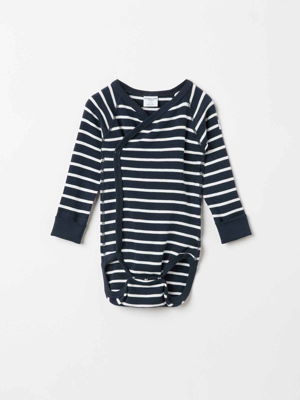 Stripet omslagsbody i 100 % økologisk bomull til baby. Bodyen har ekstra myke sømmer som er skånsomme mot sensitiv hud. Trykknappene langs omslagsåpningen gjør det enkelt å skifte klær.